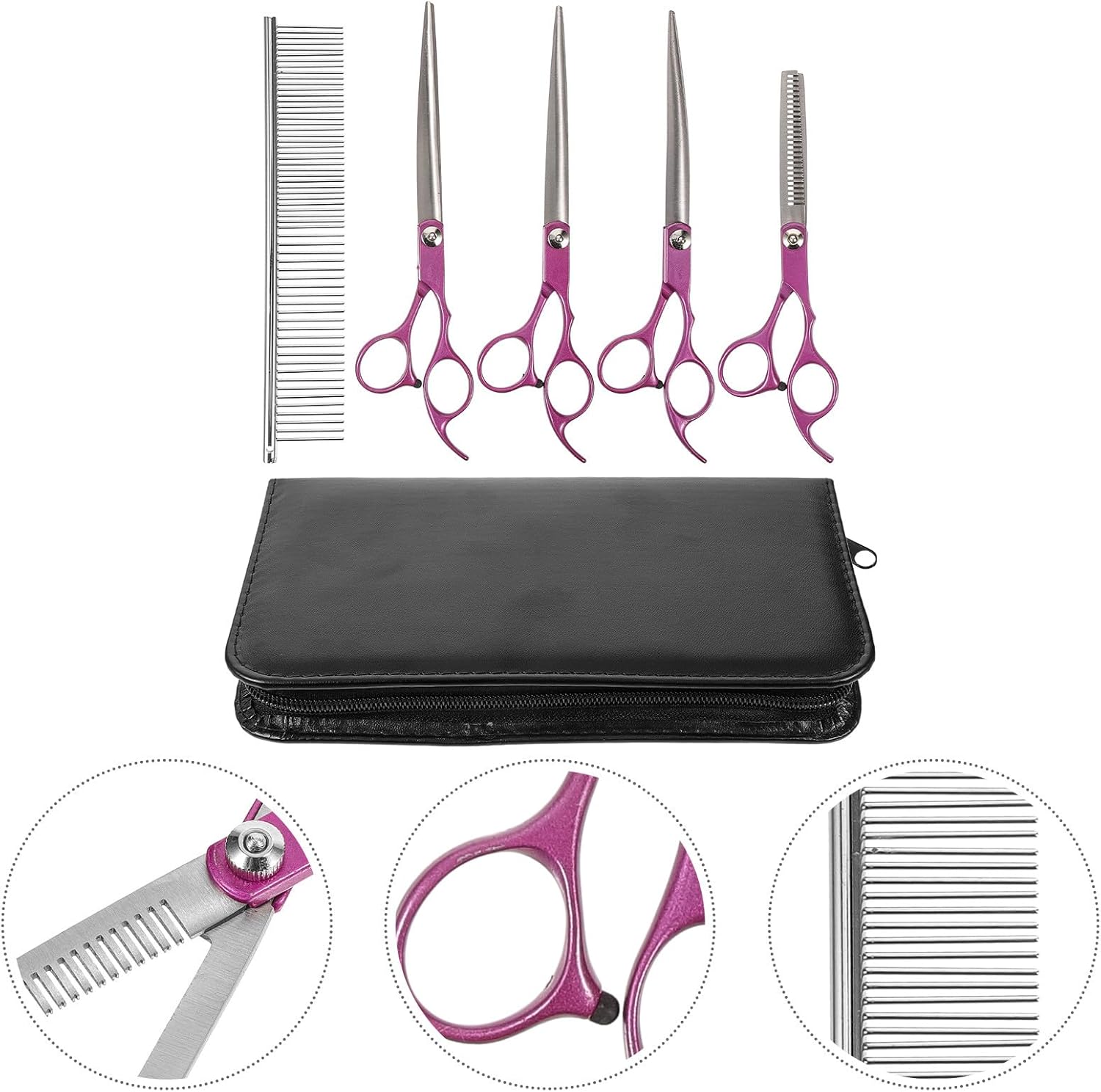 Package List 1 1 x Storage Bag 1 x Thinning Scissor 1 -Curved Scissor 1 x Down-Curved Scissor 1 x Straight Scissor Features -Material:Stainless steel -Color:Purple -Size:21.70X11.60X2.80cm/8.53X4.56X1.10in(storage bag) -Product Info:Pet grooming scissors set - Can be given as a present to your family and friend. They will like this practical present dog grooming shavers. - With fine craftsmanship and light weight, Pet Grooming Kit bring you satisfied using experience dog grooming sicssors. - Made of good and practical material, this Dog Grooming Kit also can be used for a long time. - Adopt of sturdy and strong stainless steel material for durable use. It can be used for a longtime. - This pet grooming scissor is a very important tool for you if you have dog or cat dog groomingscissors.Goods Informationsmall dog grooming kit Are you looking for a , yet , a pet hair trimmer? Are you in search of a sturdy, trustworthy Pet Grooming Scissor at once? , ! Our cat hair trimmer must meet your needs. pet grooming tools It is one of the for you