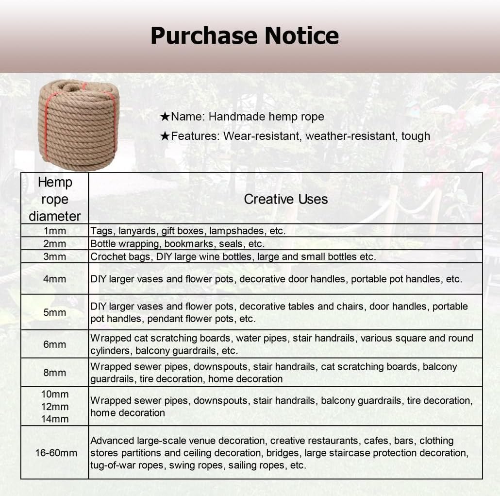 Are you still looking for a versatile hemp rope?Our natural hemp rope is hand-woven from natural jute fibers, it is soft and strong, tough and weatherproof, it can withstand various harsh environments; It comes in a variety of sizes and specifications to meet your different needsSpecificationName: Natural Hemp RopeMaterial: Natural Jute FibersDiameter: 1-60mmFeatures: Soft, strong, weather-resistant, weather-resistant, high temperature resistant, wear-resistant, and tough temperature resistance, wear resistance, good toughness, soft rope, strong and sturdyApplications: Indoors, it can be used for crafts, cat scratching posts, landscaping, home decoration, vintage room decor, stairwell decoration, and more; Outdoors, it can be used for scenes such as tug of war, hanging flower baskets, gardening, swing bed suspensions, camping, seawall fencing, posts on docks, thick rope outdoor bar projects, hanging pictures on walls, and many othersCustomized availableFeatures1. This twisted manila rope is weatherproof and has strong weather resistance2. The jute rope can be easily cut to any length, making it convenient for use in a variety of projects and applications.3. The hemp rope is soft and easy to tie4. This multifunctional rope is made of natural jute fiber, which is strong and toughPackage Includes:1 x Jute Rope Please note:1. Manual measurement may result in an error of 1-3 cm, please understand2. Due to different lighting and displays, there may be visual color differences, please refer to the actual product3. If there is a slight smell, it is normal and will disappear within two to three days4. The hemp rope will shrink 3%-5% when exposed to water; If you plan to use it outdoors, please take this into consideration
