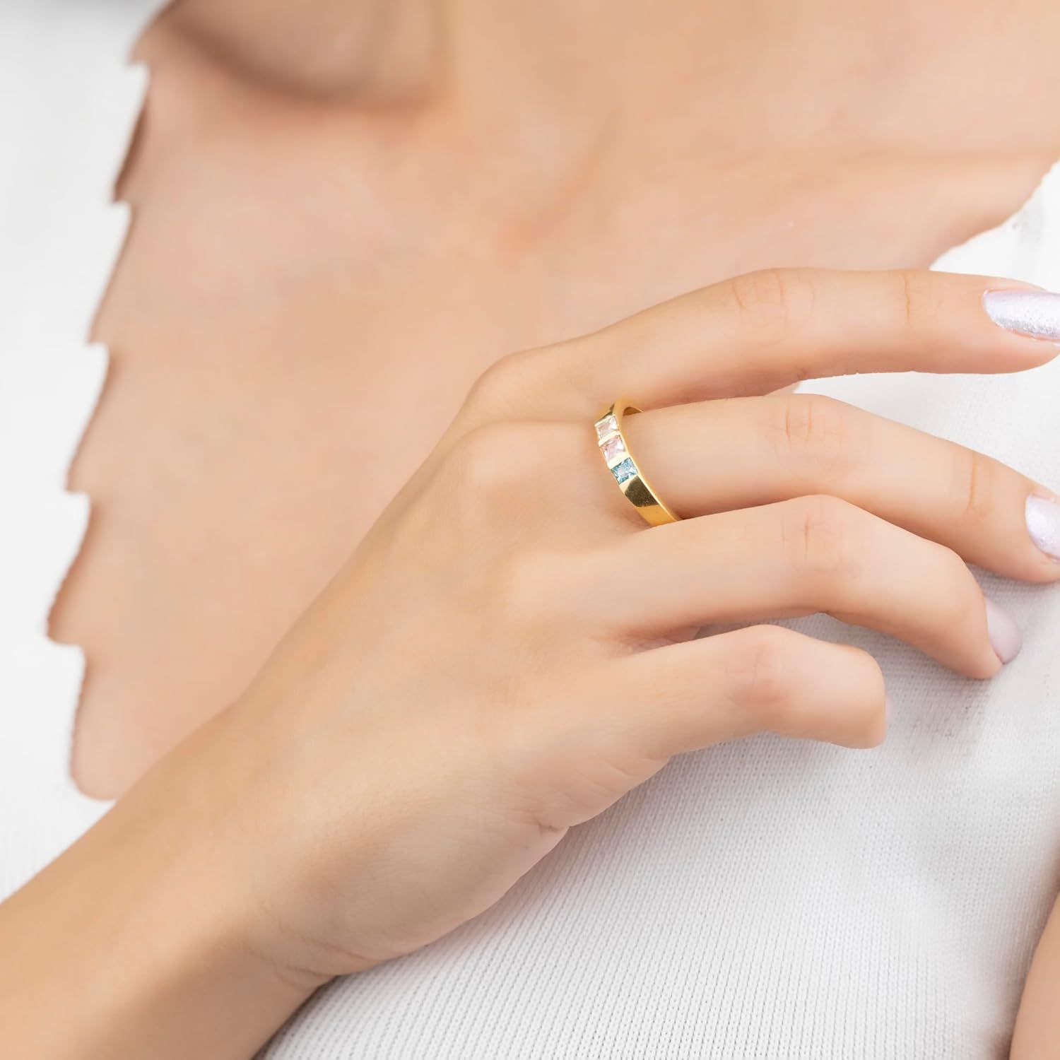 ✔ You can choose one of 12 birthstones for the 1-7 stones marked on the ring ✔ This may symbolize people who are valuable to you. ✔ Or you can just choose the colors of these stones because you like them : ✔ By clicking on the personalization button; You can choose all your personalization options such as the stones you want, product color, ring size and materials. ✔ This birthstone sterling silver ring would make a great personalized gift. This ring, which is completely handmade, can be made special for your mother and family. A wonderful ring that will make your loved ones happy on mother's day, valentine's day and christmas.♥ PRODUCT DETAILS ♥✔ Band Width: 3.8 mm✔ Square gemstone Size: 3*3 mm✔ Material: Sterling Silver, 14k gold✔ Color : Silver, Gold, Rose gold✔ Size: 3 us to 13 us✔ Luxury Jewelry minimalist Style