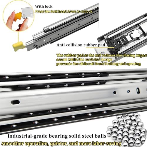 Heavy-duty drawer slides, double-row solid carbon steel ball bearings ensure smooth operation, quiet and labor-saving, with lock design, safe and secure, three-section full extension, easy to take and put, suitable for various scenarios, easy to install Size: 10in-80in Name: Heavy-duty drawer slides with lock Material: cold-rolled steel Lock: lockable design Lock color: yellow Width: 76mm/3" Steel thickness: 2.5mm/0.1" Track thickness: 19.5mm/0.76" Maximum load: 220kg (the longer the size, the smaller the load) Installation clearance: 19.2mm±0.3mm(0.75"±0.1") Surface treatment: blue seal Application range: cabinet warehouse containers, financial equipment, industrial drawers, vehicles, RV magic boxes, guardrail sliding doors, solar panels Installation method: side installation Packing list: 2x slides + 10 mounting screws