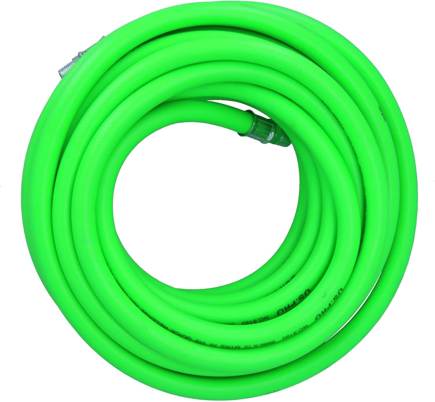 Professional air hose for commercial or occasional use A high rubber content air line 10 metres / 33 feet of air line hose 8mm internal hose for high air flow Quick release air hose with 2 standard 1/4 BSP male screw threads on either side Suitable for use with all 1/4 BSP threaded fittings Rubber airline / hose is not as sensitive as plastic hoses so retains its flexibility in all temperatures Extremely flexible bend of rubber and PVC allowing the item to withstand been driven over / trod on or change in air temperature High visibility air hose so a lot less chance of tripping over as easily seen Bend restrictions at each end for longer life (to prevent cracks and air leaks) SPECIFICATIONS Hi-Vis air hose Total length – 10 metres / 33 feet Internal hose diameter – 8mm External hose diameter – 14mm Working pressure – 15 BAR / 300 PSI Burst pressure 30 BAR / 600 PSI Operating temperature – 10 – 60 degrees Colour – high visibility green Attachment type – 1/4in BSP male fitting at each end Silicone free