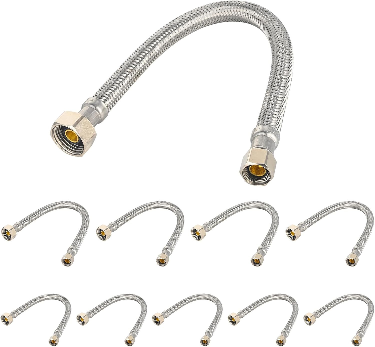 10-pack 20 in. of length connector with 3/8 in. compression connection to water shut-off valve Bends without kinking or crimping, installation is easier, especially in cramped quarters External corrosion resistance to common household, tile and glass cleaners 8-sided pneumatic crimp for greater dependability and reliable nut-to-hose connections Temperature rating: 40° to 140°F, intermittent to 180°F Pressure rating: 125 psi maximum, No-lead , safe for potable water