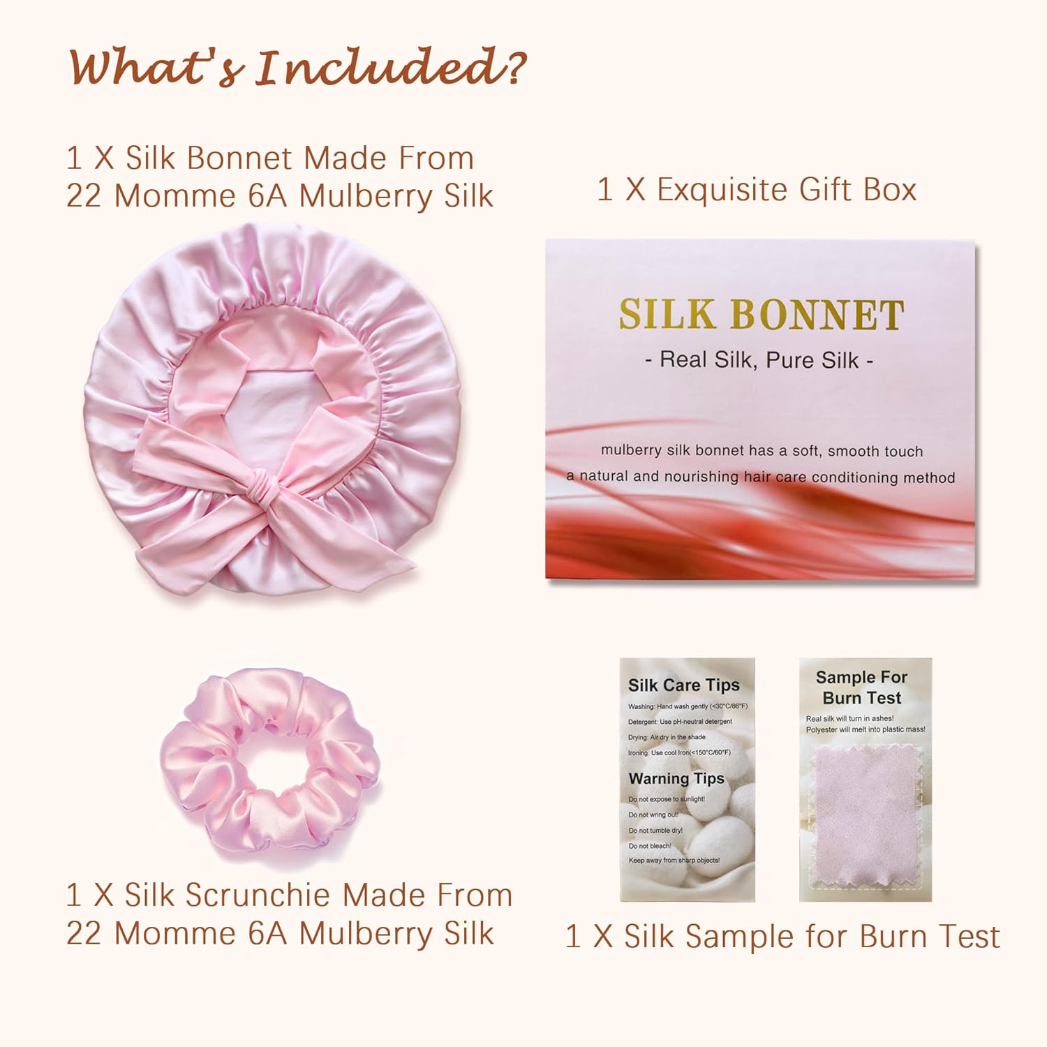 Give Your Hair the Overnight Luxury It DeservesToss and turn all night? Struggle with morning frizz, tangles, and broken hairstyles? This 22 Momme Mulberry Silk Bonnet is your ultimate nighttime hair solution. Made from the high quality 6A Grade Mulberry Silk, it’s more than a cap—it’s a nourishing treatment that works while you sleep.The End of Morning Frizz: Silk's smooth surface allows your hair to glide, greatly reduces friction between hair and pillow, effectively preventing hair breakage, dryness, frizz and split ends. Real silk bonnet also helps retain your hair's natural oils and moisture, so you wake up with smoother, shinier, and healthier-looking hair every day.Customizable Comfort for a Secure Night: Frustrated with bonnets that slip off? Our unique tie-band design is the answer. The soft, adjustable ties let you achieve the perfect fit—secure enough to stay put through the most restless night, yet gentle enough not to leave indentations or cause pressure. Pure silk bonnet is the ideal solution for all head sizes and sleep positions.Designed for Real Hair & Real Life: Whether you have waist-length waves, protective braids, voluminous curls, or fine, thinning hair, our large, roomy design has space for it all. The breathable silk keeps you cool, and the elegant design makes it a pleasure to wear. It’s the effortless way to protect your hair investment, from expensive extensions to your natural growth journey.A Gift of Self-Care: Presented in a luxurious gift box, this silk bonnet is more than a hair accessory; it's a thoughtful token of care. This silk bonnet for sleeping is the perfect present for anyone who values beauty sleep and healthy hair.For maintenance, please hand wash in cold water with neutral detergent, do not bleach or tumble dry, and hang in a cool ventilated place to dry.
