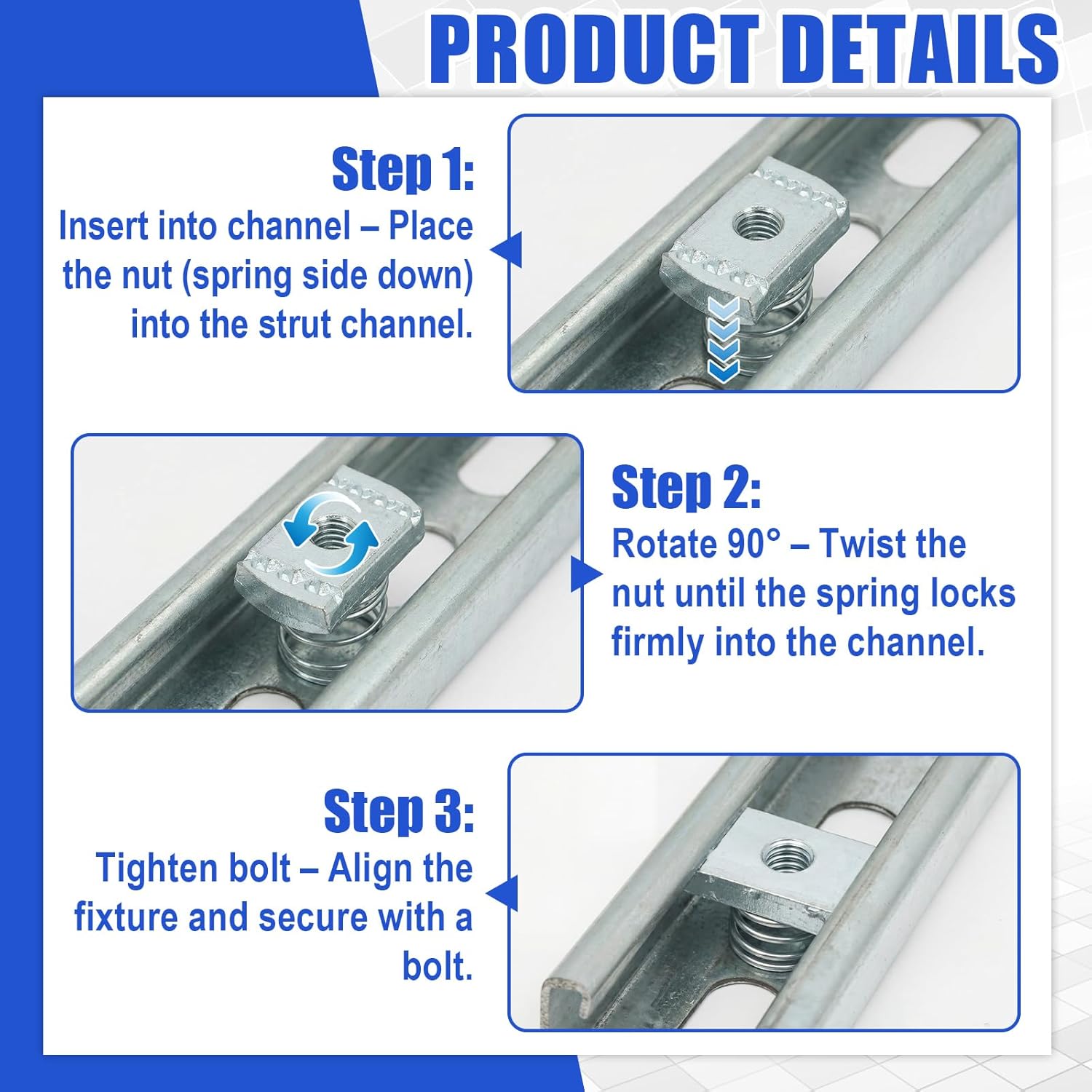Features: Smooth Finish: Each nut is precision manufactured for uniform thread integrity and a smooth zinc-plated finish, preventing snagging and ensuring effortless, reliable performance every time. Reusable Nuts: Designed for non-marring installation and easy removal without damaging the strut channel, allowing for adjustments and reuse in multiple projects, saving cost and effort. Specifications: Material: galvanized Carbon Steel Size: about 1.18x0.79x0.315 inches(30x20x8 mm) Package includes: 100 x 5/16"-18 strut channel nuts Notes: Manual measurement, please allow slight errors on size. The color may exist a slight difference due to different screen displays