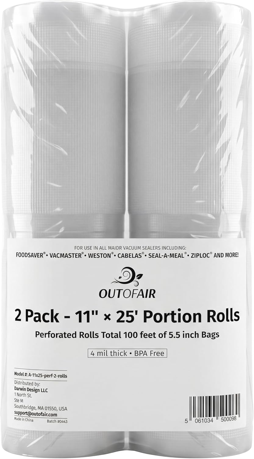 Why OutOfAir Vacuum Sealer Bags? 60-Day Guarantee OutOfAir 25-foot rolls are designed to fit inside machines that have internal roll storage. 50 foot rolls are too large to fit. Many others make shorter 16 foot rolls. Thicker than other bags 7 layers, 4 mil, PE/Nylon Thicker means stronger - less risk of sharp points breaking the vacuum seal Thicker means better - helps to reduce freezer burn Writing Area: Large white sections where you can easily write date/contents More Features:BFA Free Freezable Boilable - Great for Sous Vide Microwave Safe Dishwasher Safe Reusable Works with all "clamp style" vacuum sealers: Works with FoodSaver Works with Tilia Works with VacMaster Works with Weston Works with Cabelas Works with Rival Works with Seal-a-Meal Works with Ziploc And others Other Uses Protect electronics/small objects when boating or going out in the rain. Help to preserve and protect important documents/photos