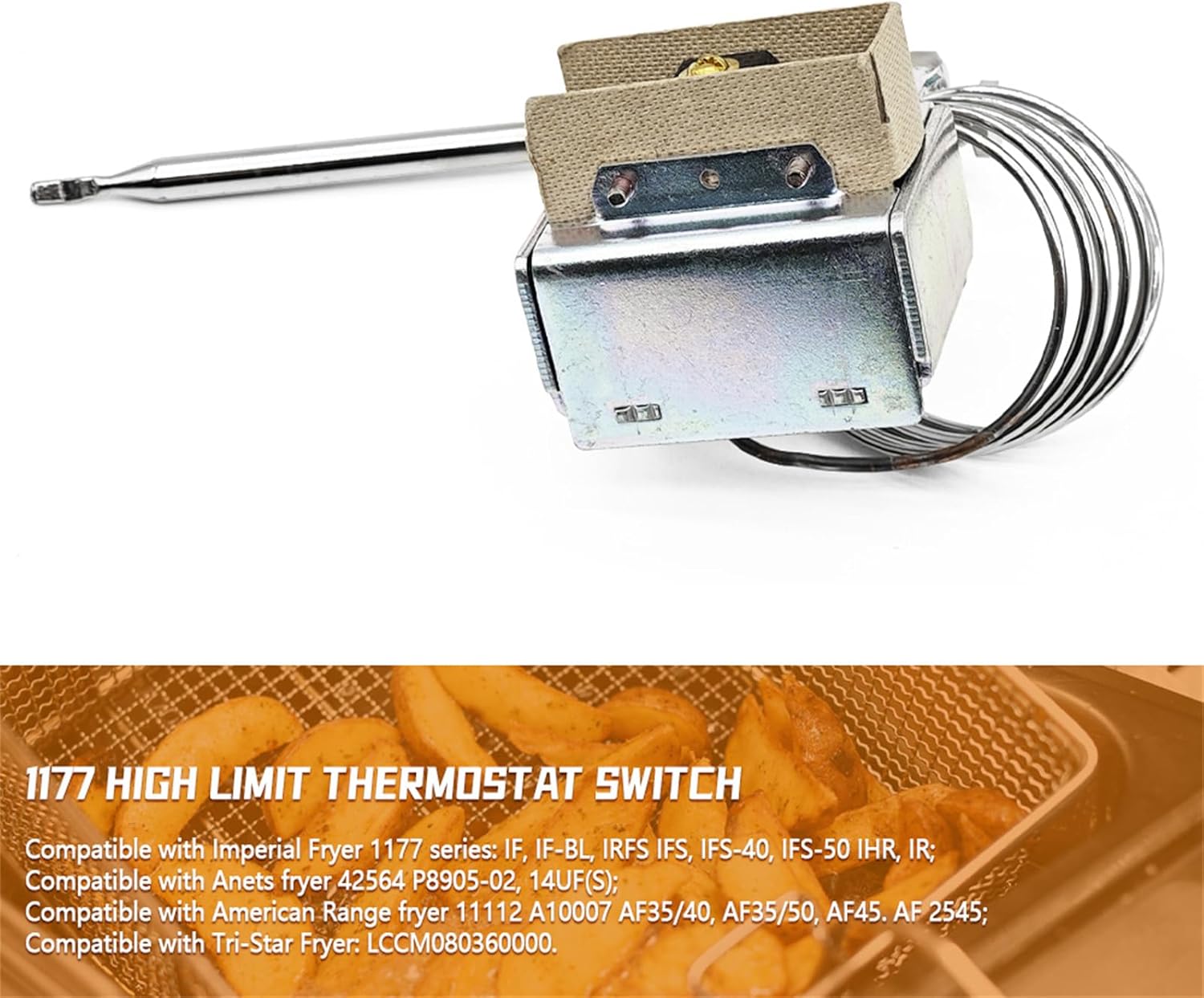 Upgraded 1177 High Limit Thermostat Switch FITMENT: The Thermostat Fits Bulbs Up To 3/8" Mpt Stuff Box, works on millivolt systems Compatible with Imperial Fryer 1177 Series IF, IF-BL, IRFS IFS, IFS-40, IFS-50 IHR, IR Compatible with Anets Fryer 42564 P8905-02, 14UF(S) Compatible with American Range Fryer 11112 A10007 AF35/40, AF35/50, AF45, AF 2545 Compatible with Tri-Star Fryer LCCM080360000 Compatible with Hobart 00-410840-00002 00-419670-00002 110840-2 119670-2 410840-00002 410840-2 419670-00002 419670-2 Compatible with VULCAN 1GR45C, 1GR45D, 1GR45M, 1GR65C, 1GR65D, 1GR65M, 1GR85C, 1GR85D, 1GR85M, 1GRC35, 1GRC45, 1GRC65, 1GRD45, 1GRD65, 1GRS35, 1GRS45, 1GRS65, EF3, EF4, EF5, GR, VF2, VF2D, VMF2, VMF2D Compatible with Atosa Catering Equipment Hi-Limit 301030005 Compatible with ROBERTSHAW LCCM2003000 Compatible with Royal Range 3112 SPEC: Limit Temperature: 450°F Works On: Millivolt Systems Installation: Plug and Play Design Compatible Appliances: Gas Fryers, Commercial Deep Fryers (Catering Equipment) PACKAGE INCLUDES: 1x 1177 Hi-Limit Switch Thermostat