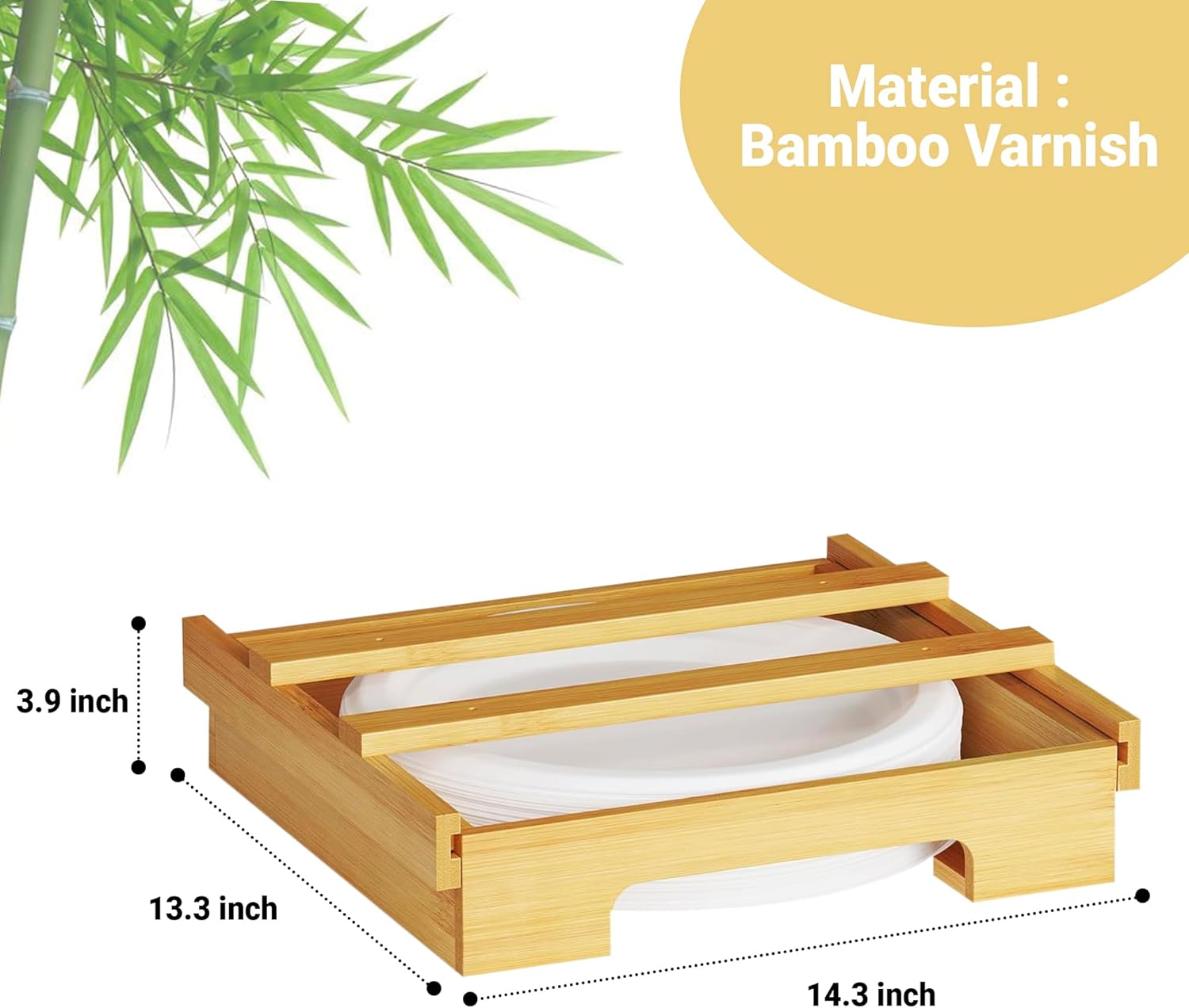 Our Eydga bamboo plate dispenser adds a touch of elegance to your kitchen while keeping your plates organized. With a capacity for up to 12-inch paper plates, this varnished bamboo dispenser is durable and moisture-resistant. Perfect for your kitchen countertop, it combines style and functionality in one accessory. Elevate the look of your kitchen with this stylish dispenser. Get yours now!