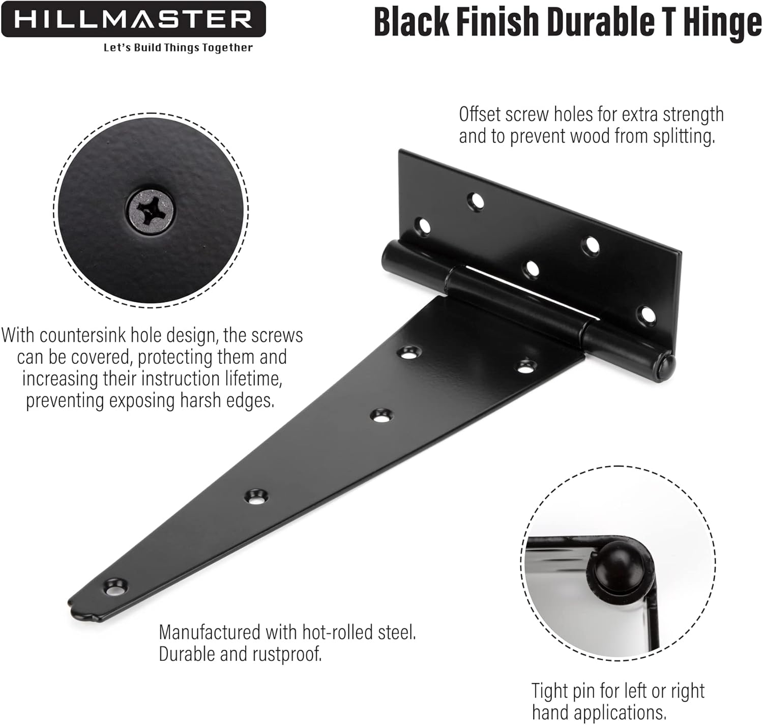 HILLMASTER Heavy Duty Durable Gate Strap Hinge Added Stability and Ease of Function.Package Included:4 x 12inch T-Strap hinges40x 1-1/4inch ScrewsFeature:➤Counterbore hole design, flat surface after installations.➤Last a long time without showing wear or rust.➤Tight pin for left or right hand applications.➤Easy to Install for various DIY project.➤Silent and smooth experience.Specifications:Color: BlackMaterial: Steel IronThickness:1/8”Total Size: 12”x6-11/16”x2-1/2”Load Capacity: 110 lbsRotation Angle: 0 - 270These gate hardware are engineered for strength and longevity and will enhance your wooden gate or fence security design.