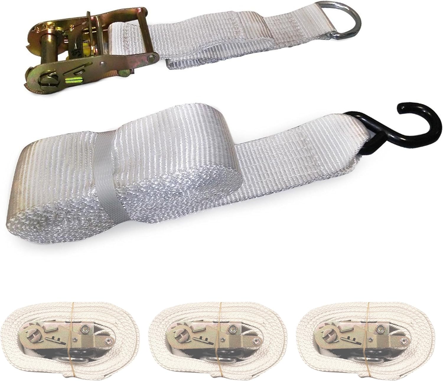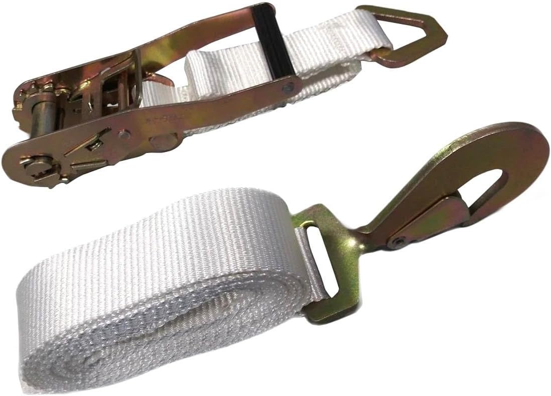 Our 1.5" x 13' Ratchet Straps provide an easy and stable way to anchor large and small party tents and inflatables of any size. A strong ratchet buckle is sewn directly into the end of the ratchet strap with a D-ring sewn in to the fixed end. The adjustable strap has a sturdy S-hook sewn into one end to attach it to the tent or inflatable stake. durable and flexible polyester webbing makes up the fabric straps. Ratchet straps can also be used to keep cargo tied down inside trucks both freight and delivery.