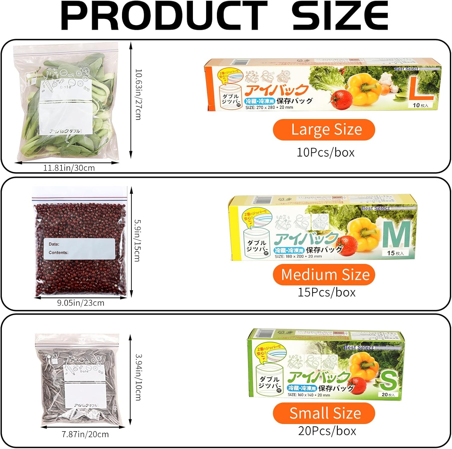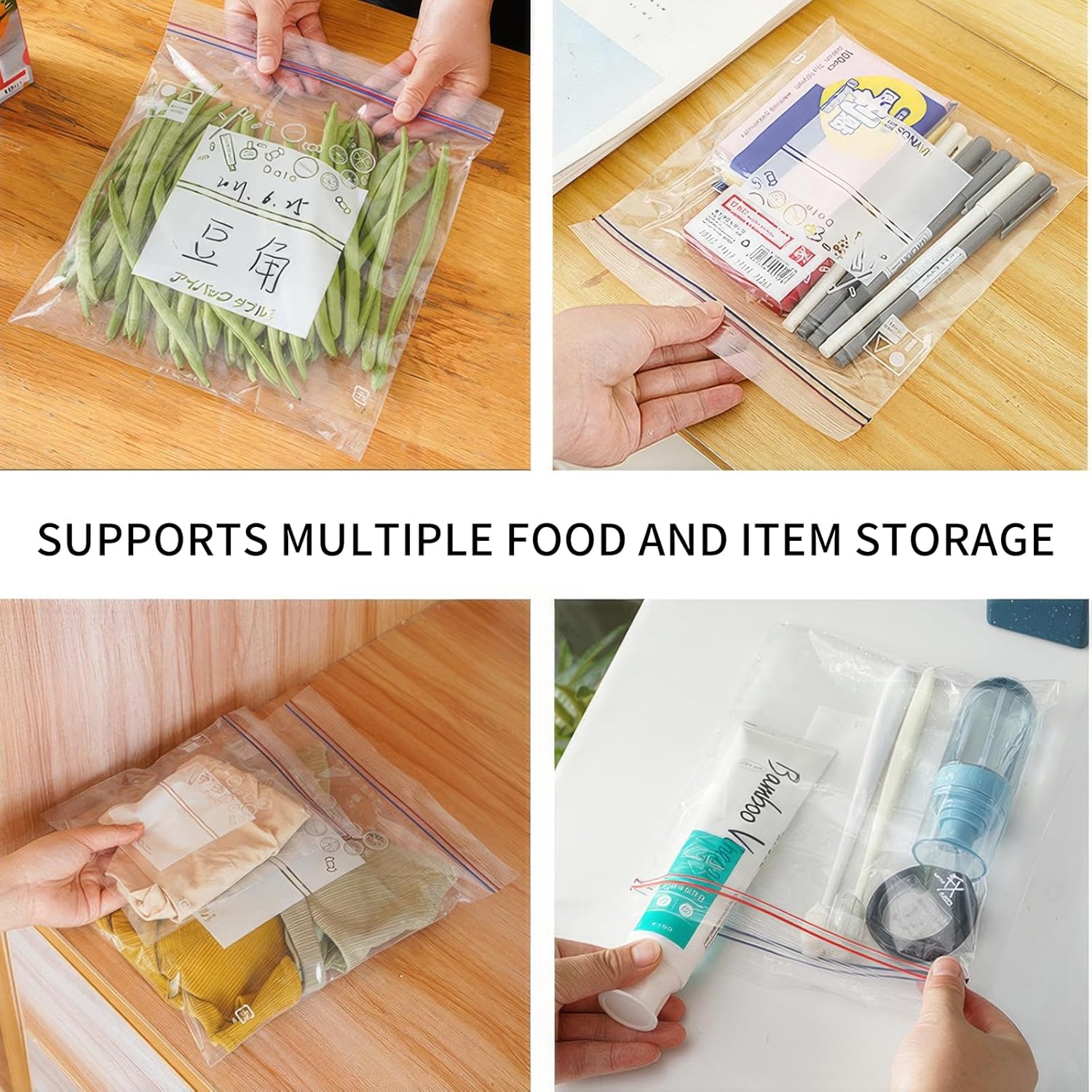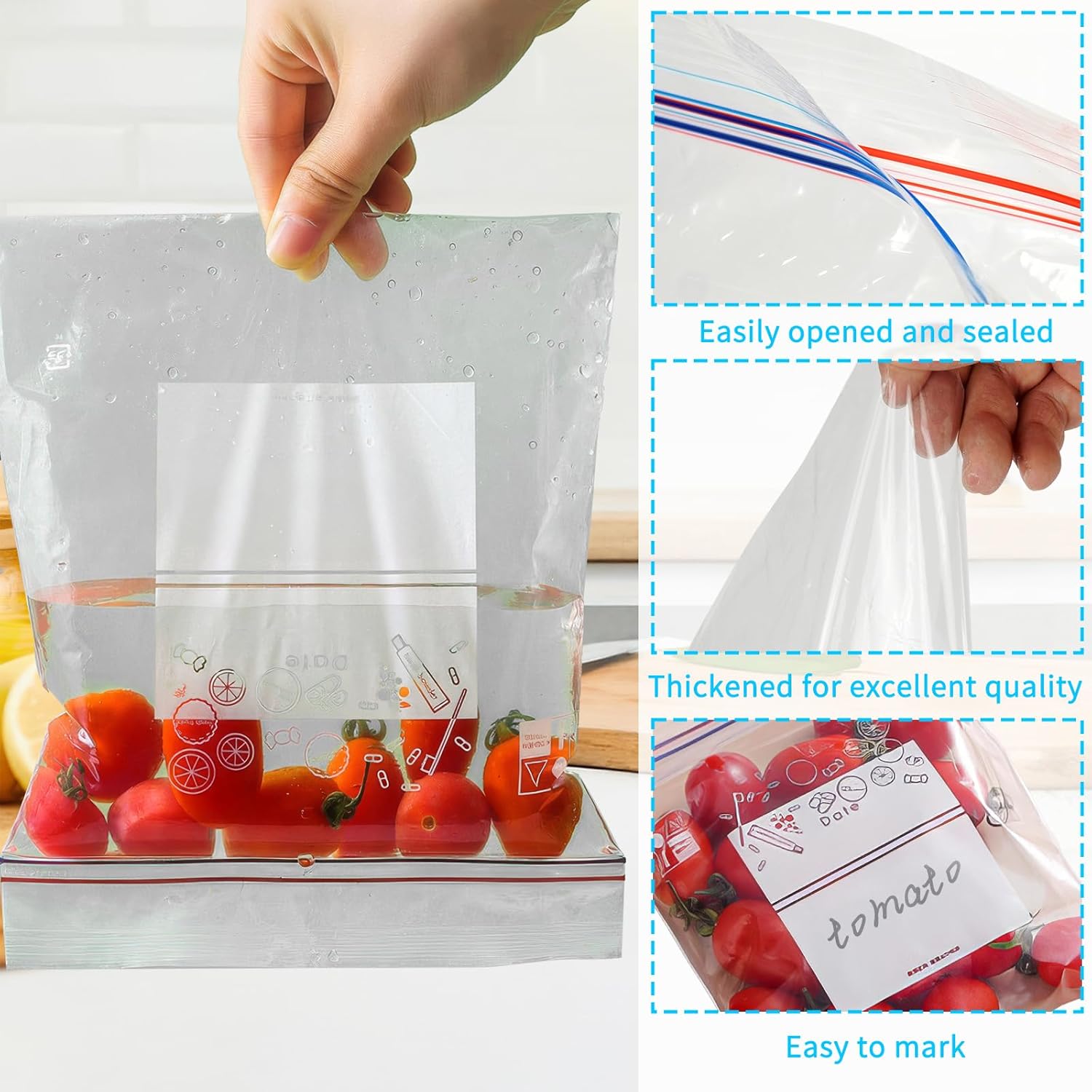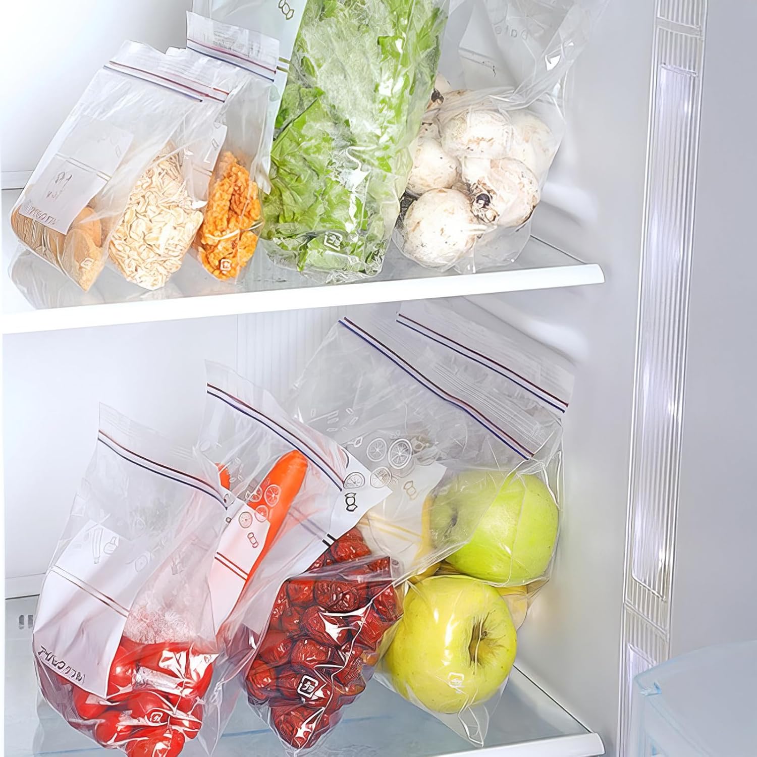 These reusable Ziplocks perform well in both freezer and microwave environments, experience the convenience of our innovative reclosable closure that makes opening and sealing seamless every time. Excellent Features: Comprehensive Package: Receive a total of 130 resealable food storage bags in three sizes: 40 small, 60 medium, and 30 large. These dimensions cater to various storage needs, ensuring you have enough for all preservation tasks. Premium Material: Made from BPA-free plastic, these reusable Ziplock bags withstand both high and low temperatures, ideal for freezing and heating. Double-sealed edges ensure moisture resistance, durability, and easy cleaning. Keep Lasting Fresh The resealable design allows for easy opening and sealing. Reinforced bottoms enable the bags to stand upright, making filling and organizing contents simple and efficient. Extra Writing Space Each bag features a writeable area for labeling dates and item names, simplifying content differentiation. The included dispenser box keeps bags organized and accessible. Versatile Use Perfect for storing fruits, vegetables, sandwiches, and more. The airtight seal preserves freshness and prevents flavor mixing. Suitable for everyday items like cosmetics as well. Specification: Material:Plastic Color: Clear Measurement: Large bag: 11.8 x 10.63inch/30 x 27cm Medium bag: 9.05 x 5.9inch/23 x 15cm Small bag: 7.87 x 3.94in/20 x 10cm Package Content: 130 food storage bags, comprising 40 small, 60 medium, and 30 large resealable freezer bags.