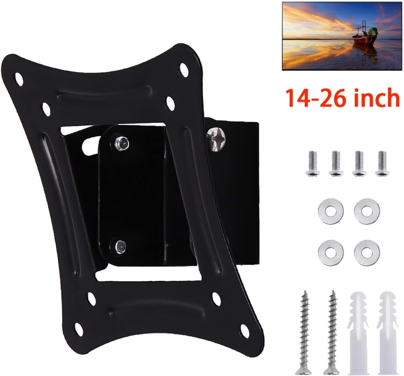 Laptop StandsParametersMax Capacity: 10KG / 22.05LBDistance From the Wall: 35mmMaterial: Cold Ligation BoardType: Adjustable TypeUp and Down Tiltable Angle: 10 degreesVESA Standard Pitch: 75mm * 75mm, 100mm * 100mmApplicable Size: 14 - 26 inchesType: Adjustable TypeDistance From the Wall: 35mmMax Capacity: 10KG / 22.05LBMaterial: Cold Rolled SteelFeatures:- Very easy to install and use, with common hardware pack included in the package.- With great heavy durable duty steel construction.- With coating finished paint, easy to clean, classic black color fit for various occasions.Color: BlackFunction: Universal TV Wall MountScope: Fit for most flat panel TV, LCD TV, LED TV, Plasma TV. Suitable for family, entertainment, public places and commercial places such as living room, KTV, bars, airports, railway stations, bus stations, shopping malls, stores waiting hall, lounge, large conference rooms, classrooms, lobby and restaurants and etc.Note:- Because of manual measurement, there will be an error of about 0 ~ 3mm.- Before purchase, please check whether the hole spacing of your TV set is consistent with this product, and whether the weight is within the tolerance of this product.- The quantity of product accessories will be somewhat deviant, and the collision in transport will result in a tiny amount of paint flaking, but it will not affect installation and usage.