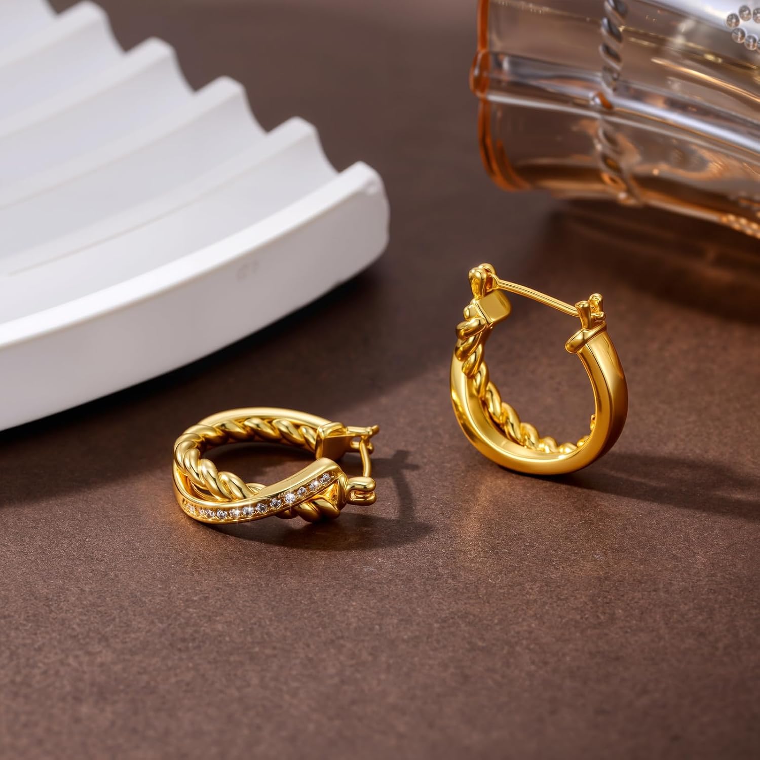• 【X-Shape Design】Elevate your everyday style or add a touch of glamour to special occasions with these 14k gold plated hoop earrings for women. Their design ingeniously combines a classic twisted gold texture with a dazzling row of pavé-set cubic zirconia that elegantly cross over. These 14k chunky gold earrings for women’s hoop earrings are a versatile and luxurious addition to any jewelry collection.