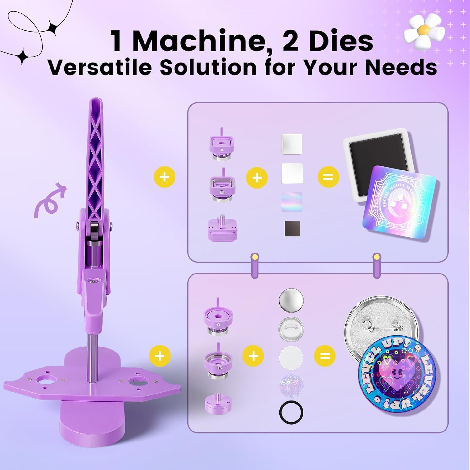 Package1 x button maker machine1 x square mold set150 x square 2''x2'' magnet making supplies1 x round mold set50 x round 2.25'' magnet making supplies