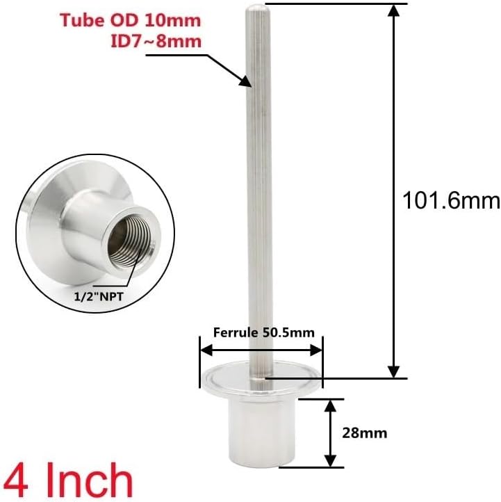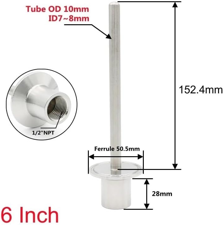 Thermowell Temperature Sensors Thermometer CoverMaterial: Stainless Steel 304Connection: 1/2" NPT Female ThreadTube Length:2 4 6 8 12 InchTC Size: 1.5" (50.5mm Ferrule OD )==========Pressure : 850 kPaHigh-concerned chemical : NoneHose Inner Diameter : 6mmConnection : FemaleType : FEMALEMaterial : Stainless SteelOrigin : Mainland ChinaCertification : None