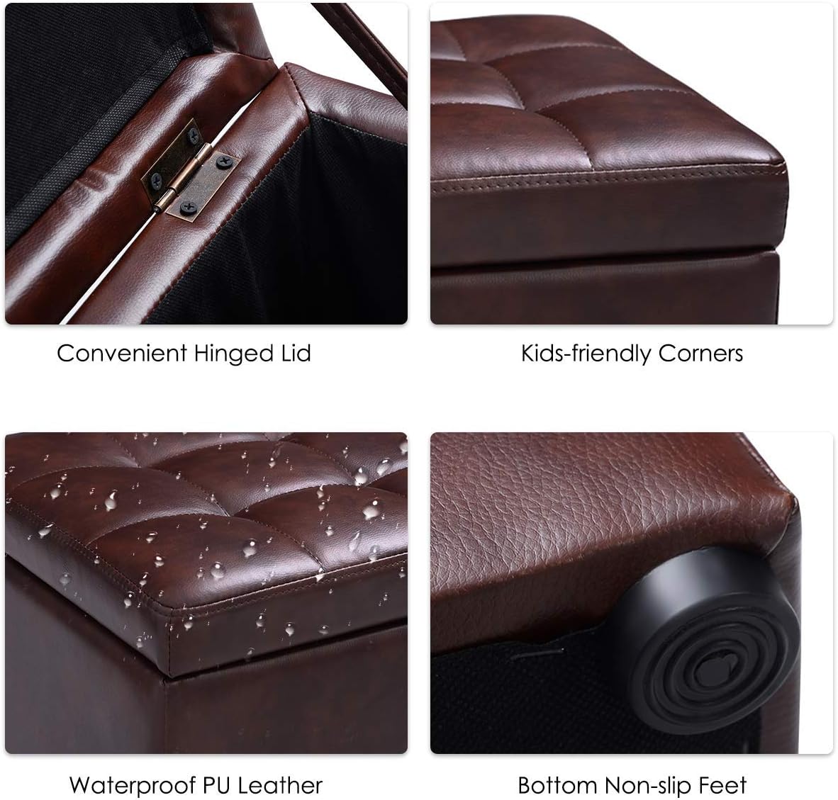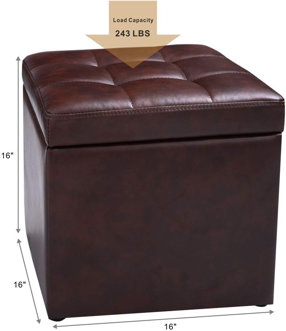 DescriptionOur HOMGX storage stool will keep your home in order. With polyurethane leather and a thick pad sponge, Ottoman will give you a comfortable seating experience. This storage footstool has plenty of storage space under the seat, providing an extra solution for storing towels, toys, books, etc. It can be used as a shoe bench, storage stool, footstool or guest Additions. Made from high-quality waterproof PU leather, this ottoman is easy to keep clean. Thanks to the solid wood frame, this storage footstool is sturdy and durable. It has a simple cube appearance and is an expression of fashion concept that perfectly matches any space. You will need it!FeaturesThe seat is filled with thicker resilience sponge, which will give you comfortable seat feelingCovered with premium waterproof PU leather, the ottoman is easy to keep clean with a wet towelFour non-slip protective feet mounted on the ottoman can effectively protect your floor from scratchThe lid is hinged and with straps connecting to the storage box for convenient open and closeOur ottoman features an ample storage space under the seat, storing your towels, toys, books, etcIt can be used as a shoe changing stool, storage stool, a footstool or an extra seat when having guests coming overWith a simple cube design, it matches well with any space, such as living room, bedroom, cloakroom and entrywaySpecificationsColor: BlackMaterial: Wood + PU Leather + SpongeNet Weight: 9 lbsWeight Capacity: 243 lbsProduct Dimension: 16" × 16" ×16"(L x W x H)Package Includes:1 x Cube Storage Ottoman1 x User's Manual