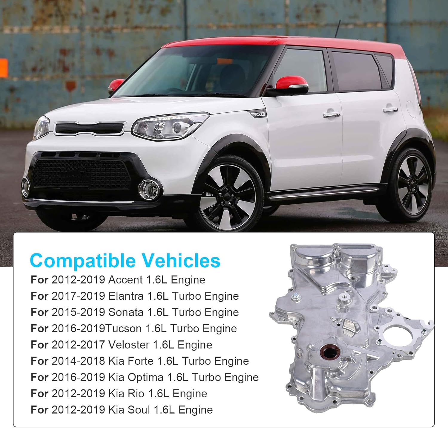 MDSAFM 1.6L Timing Chain Oil Pump Cover: For Hyundai Accent 1.6L L4 2012-2019 For Hyundai Elantra 1.6L L4 2017-2020 For Hyundai Elantra GT 1.6L L4 2018-2020 For Hyundai Sonata 1.6L L4 2015-2019 For Hyundai Tucson 1.6L L4 2016-2018 For Hyundai Veloster 1.6L L4 2012-2021 For Kia Forte 1.6L L4 2020-2021 For Kia Forte Koup 1.6L L4 2014-2016 For Kia Forte5 1.6L L4 2014-2018 For Kia Optima 1.6L L4 2016-2020 For Kia Rio 1.6L L4 2012-2020 For Kia Soul 1.6L L4 2012-2021 Color: Silver Package Include: 1* Timing Chain Oil Pump Cover