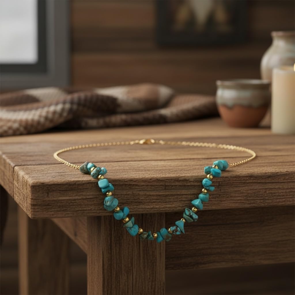 Embrace bohemian elegance with this stunning turquoise stone necklace. The delicate 18-inch chain, crafted from 18K yellow gold-plated stainless steel, features a harmonious arrangement of natural turquoise stone chips interspersed with gleaming gold-plated beads. Each turquoise fragment showcases unique patterns and variations in its signature blue-green hue, making every necklace one-of-a-kind. The durable stainless steel base ensures tarnish resistance while maintaining its luxurious appearance. A 2-inch extension chain allows for adjustable wear, perfect for styling with various necklines. The combination of raw turquoise stones and polished gold elements creates a versatile piece that transitions seamlessly from casual daytime wear to evening occasions. This necklace adds an artistic touch to any outfit, whether paired with flowing dresses or simple tops. The secure clasp ensures comfortable, worry-free wear throughout your day.