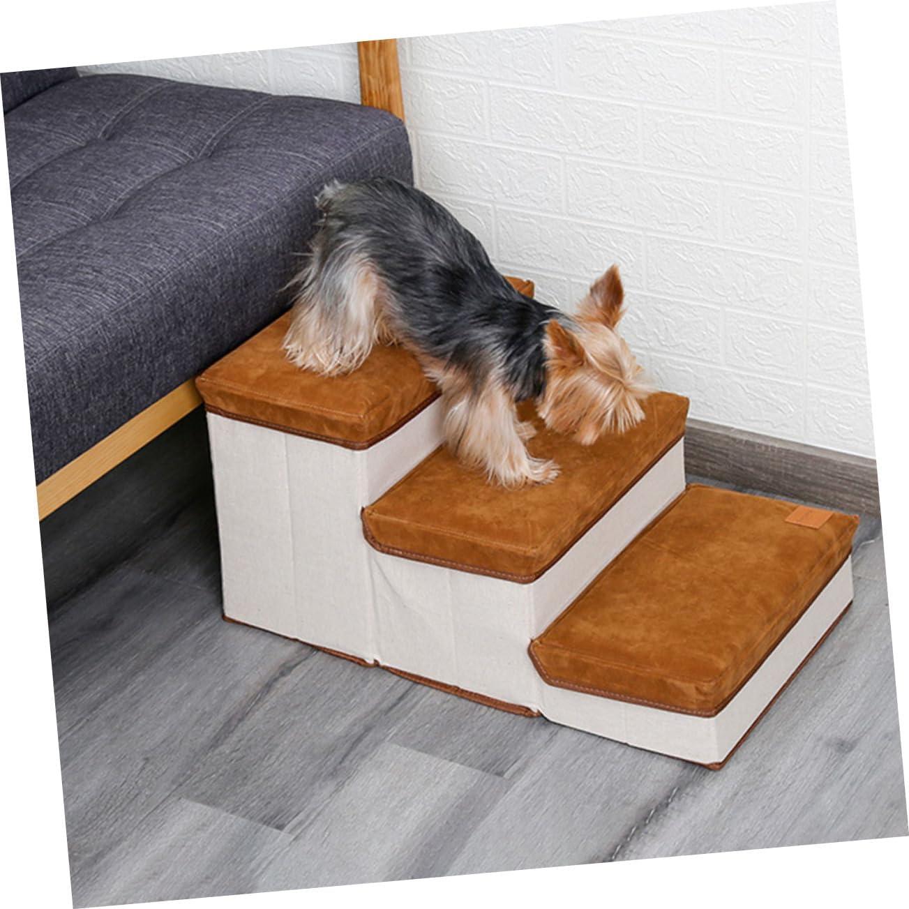 Package List 1 x pet stair Features - Color: Brown Dog Stair - Material: Lint and cotton cloth Pet Stair - Size: About 60.00X35.00X30.00cm/23.58X13.76X11.79in Stair for Puppies - It can be contracted when not in use, and it does not take up space Foldable Pet Stair. - A perfect accessory for helping your or reach that high bed or couch Storage Case Stair. - The pet step adds a sturdy bottom plate to get a sturdy staircase for dogs Pet Playing Stair. - And it features the large-capacity storage space to store dog clothes, traction, blankets and nursing tools Pet Supplies. - The pet stair is both a dog's stairs and a storage box for dogs' objects Dog Ladder.Goods DescriptionPet Ladder Our stairs are the perfect accessory to help pets reach that high bed or couch! Made with mattress-grade cushioning to pressure on paws and joints.Storage Case Stair Soft and comfortable, flexible, prevent pet from being injured