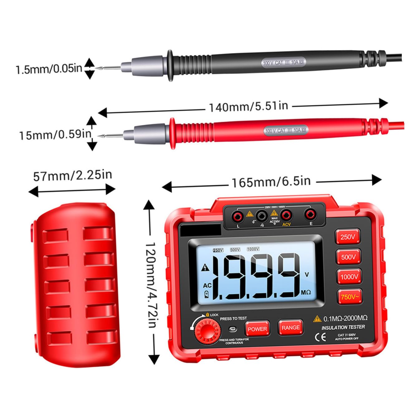 Package List 1 x Digital Megohmmeter 2 Cables 2 x Clamps 1 x Manual 1 x Packing Box Characteristics - Output : /500V/1000V Electronic Megohmmeter. - Material: ABS, rubber, brass Digital. - Median resistance: /500V: 2MΩ, 1000V: 5MΩ LCD Display Megohmmeter. - Battery: 8 x AA battery (not included) Digital Insulation Resistance Tester. - Range insulation resistance: : 0.1 MΩ ~ 20MΩ, 500V : 0.1 MΩ ~ 50MΩ, 1000V : 0.1MΩ ~ 100MΩ; : 20MΩ~500MΩ, 500V: 5OMΩ~1000MΩ, 1000V: 100MΩ~2000MΩ Backlight Megohm Meter. - High indication: There is a LED light (HV ON) in the machine and “HV” is displayed on the left side of the display screen, indicating that there is high output in the instrument, there is a of electric shocks, the operator should pay special attention to safety Meter. - measurement: 750V Backlight Resistance Tester. - Maximum display: 1999 counts LCD Insulation Resistance Tester. - Short circuit : <1.6MA - Size: 16.50X12.00X5.70cm/6.48X4.72X2.24 inch. - Test : (R=250KΩ), 500V (R=500KΩ), 1000V (R=1MΩ). - Digits display, intuitive reading. Easy to operate and carry. Strong load capacity, output short-circuit less than 1.6mA Insulation Tester. - The rated output can be selected among , 500V and 1000V by using the function knob. alert LCD Megohm Meter.Goods DescriptionMeter This digital insulation tester is made of , which can withstand use.LCD Fine workmanship, practicality.Digital Megohmmeter Features the ABS, rubber and electronic component material, which has high durability, not easy to deform