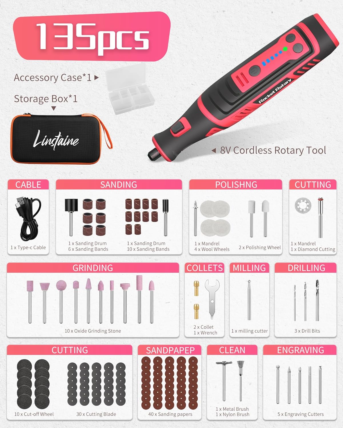 8V Cordless Rotary Tool Kit with 135pcs Accessories, 2.8Ah Battery Rechargeable Engraving Pen with LED Light, 5-Speed 30000RPM Power Rotary Tools for Drilling Grinding Sanding Polishing Cutting