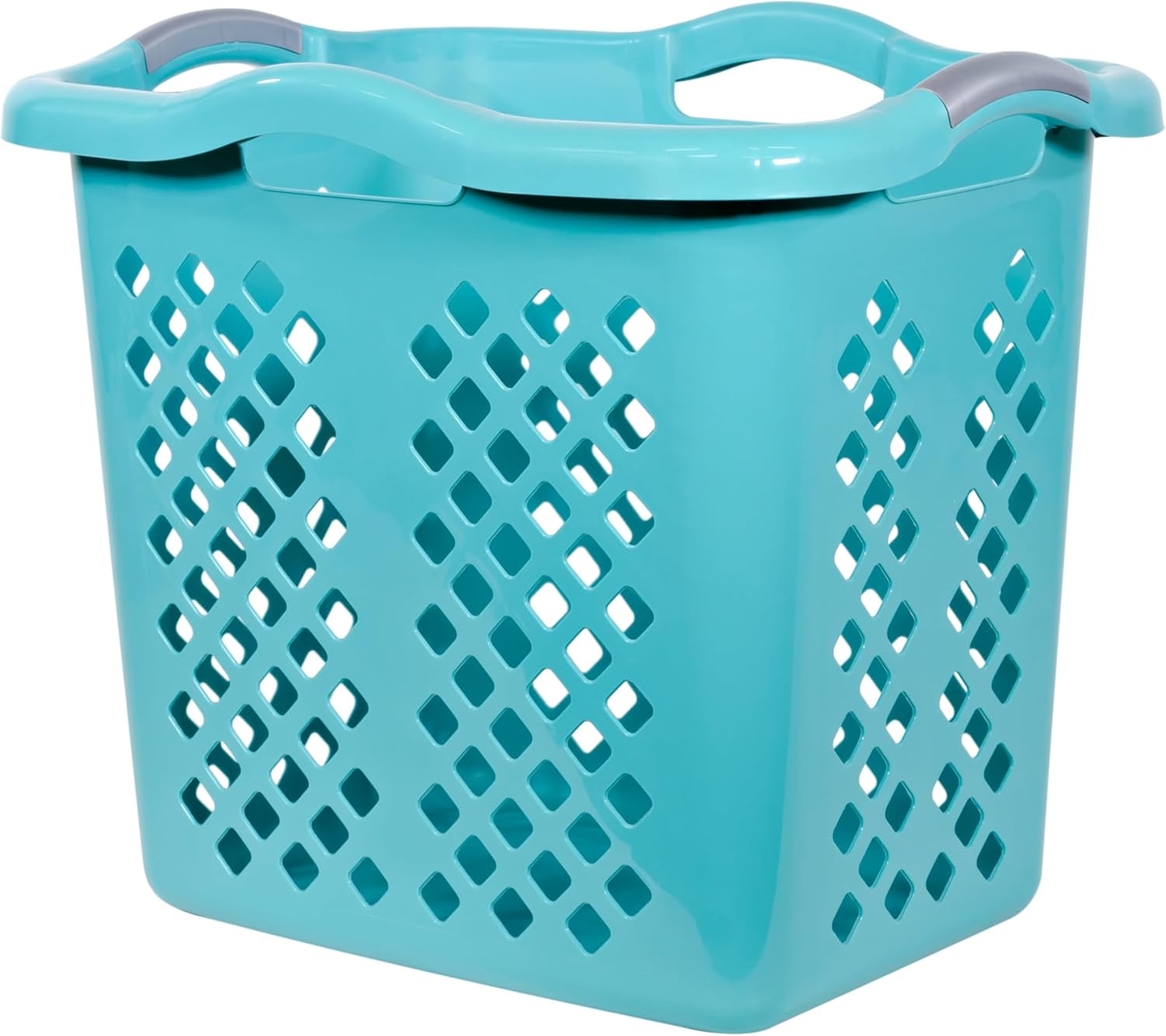 Introducing this set of 2 laundry baskets. These innovative baskets combine the height of a hamper with the convenience of a basket. With four easy-to-carry handles, you can stack folded laundry high and easily transport items throughout your home. Use them in room to collect dirty laundry or in the garage to store sports equipment. The silver baskets with teal handles ensure you always have one handy for sorting and storing. Diamond cutouts on each side provide ventilation and visibility to their contents.