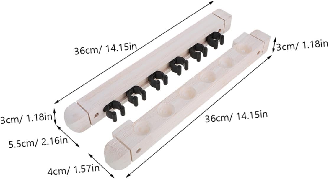 Package Include 2 x pairs of Pool Cue Racks Features -Wide application: suitable for various settings such as homes, clubs, and recreational areas, this cue rack keeps your cues in order billiard stand -Product Info:6-hole solid wood club stand -Ample storage: featuring six slots, this pool stick rack provides ample storage for multiple cues, allowing for easy organization and quick access, enhancing your playing experience billiard accessory -Convenient wall mount: the wall mounted pool rack saves space and is easy to install, keeping your cues organized and preventing them from bending or getting damaged pool storage rack -Size:36.00X5.50X3.00cm/14.15X2.16X1.18in -Strong material: crafted from solid wood, this pool stick rack offers durability, ensuring your cues are well protected -Material:Wood -Color:Beige -Elegant appearance: the cue rack enhances the decor of your billiard room, adding a sophisticated touch and improving the overall ambiance pool wall mounted shelves -Size:36.00X4.00X3.00cm/14.15X1.57X1.18inGoods Descriptionbilliard pool holder This pool stick rack is ideal for keeping your cues organized and easily accessible, enhancing your overall playing experience.solid wood billiard racks Its solid wood construction provides durability and , adds a modern touch.billiards chalk holder The sleek design of this wall-mounted cue holder makes it a nice addition to any billiards room