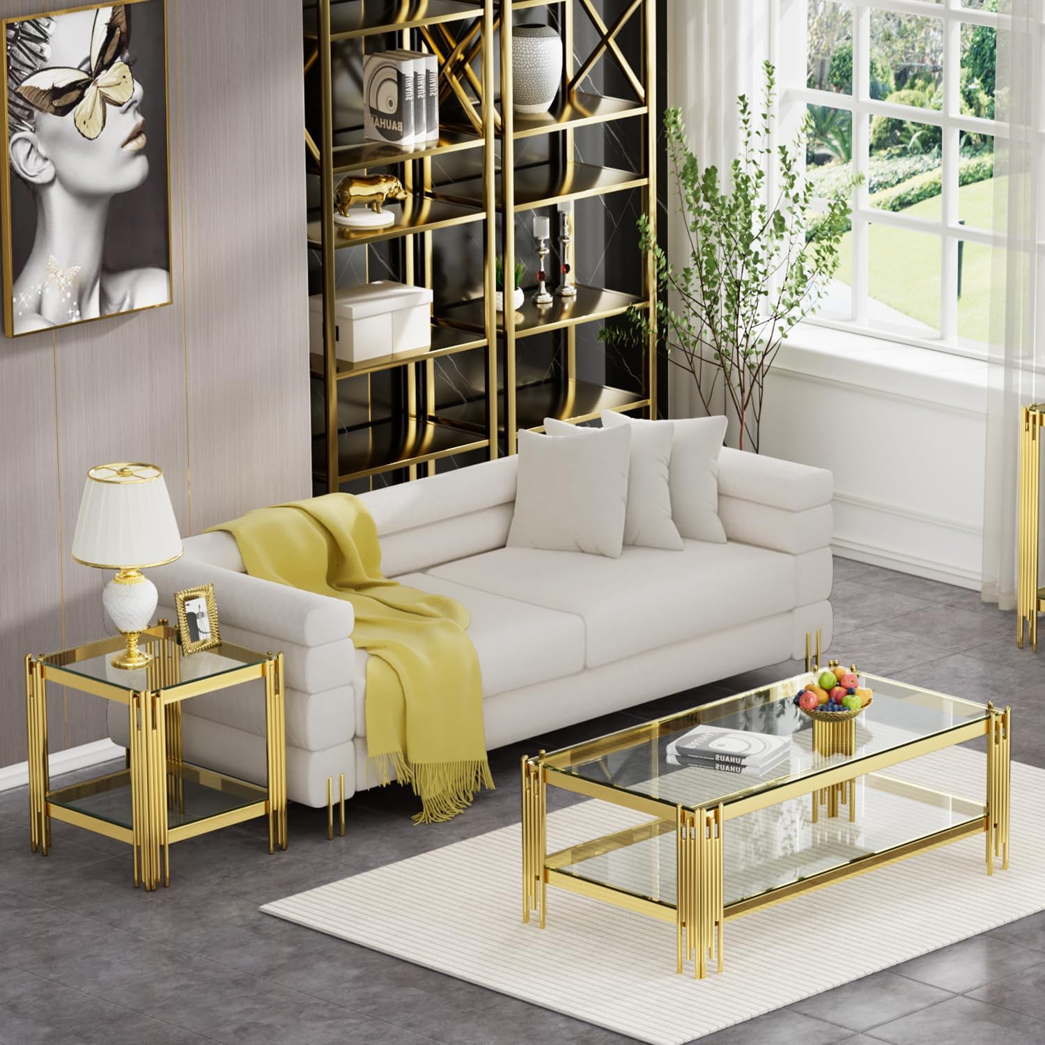 Feature Minimalist design style, glass and stainless steel collocation. The overall atmosphere brought by the three-piece sets, neat and stylish. Tempered glass table top and thickened sturdy architecture. Non-slip and scratch-resistant foot pads, high quality hardware and easy installation methods. Product details ◆ Product Type: Living room table Set ◆ Top Material: Tempered Glass ◆ Frame Finish Application: Painting ◆ Base Color: Golden/silver ◆ Frame Material: Stainless Steel ◆ Level of Assembly: Simple Assembly Needed ◆ Estimated Time to Set Up: 30min ◆ Adult Assembly Required: Yes