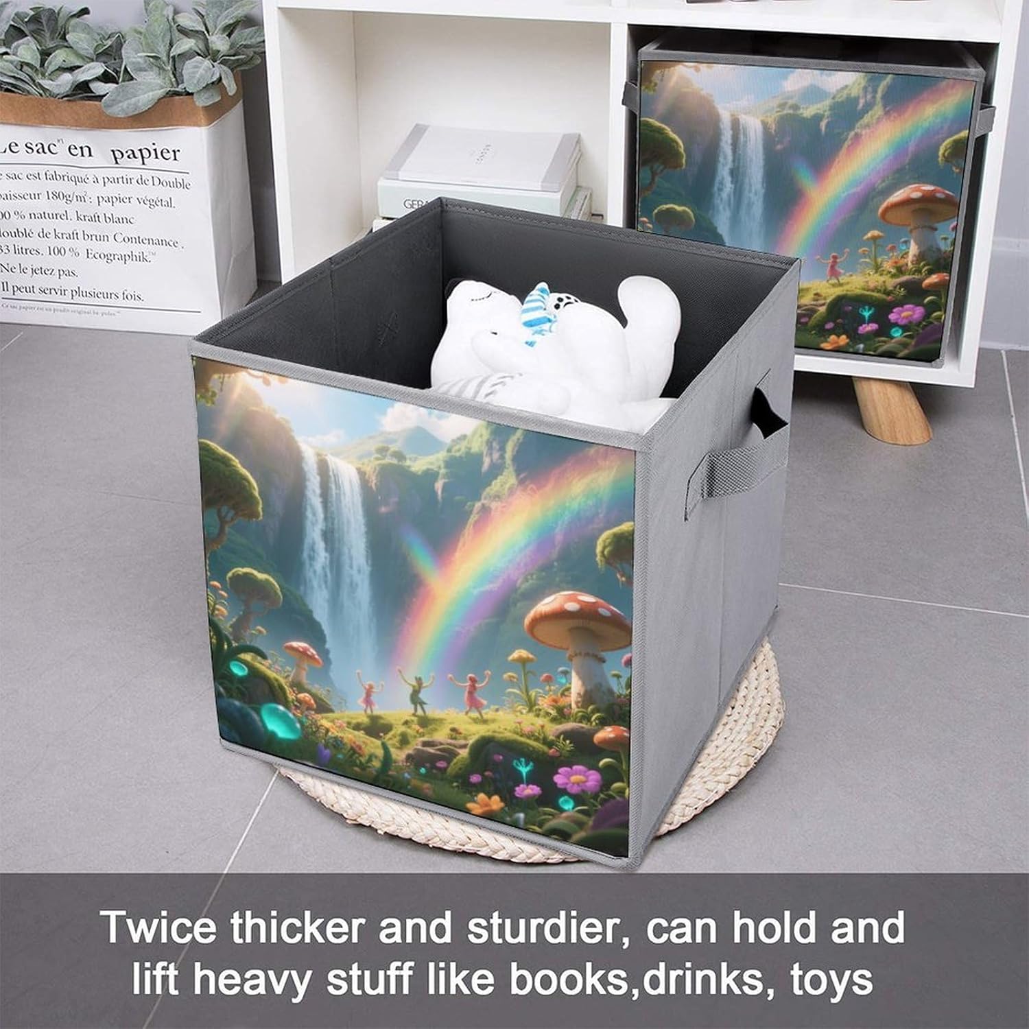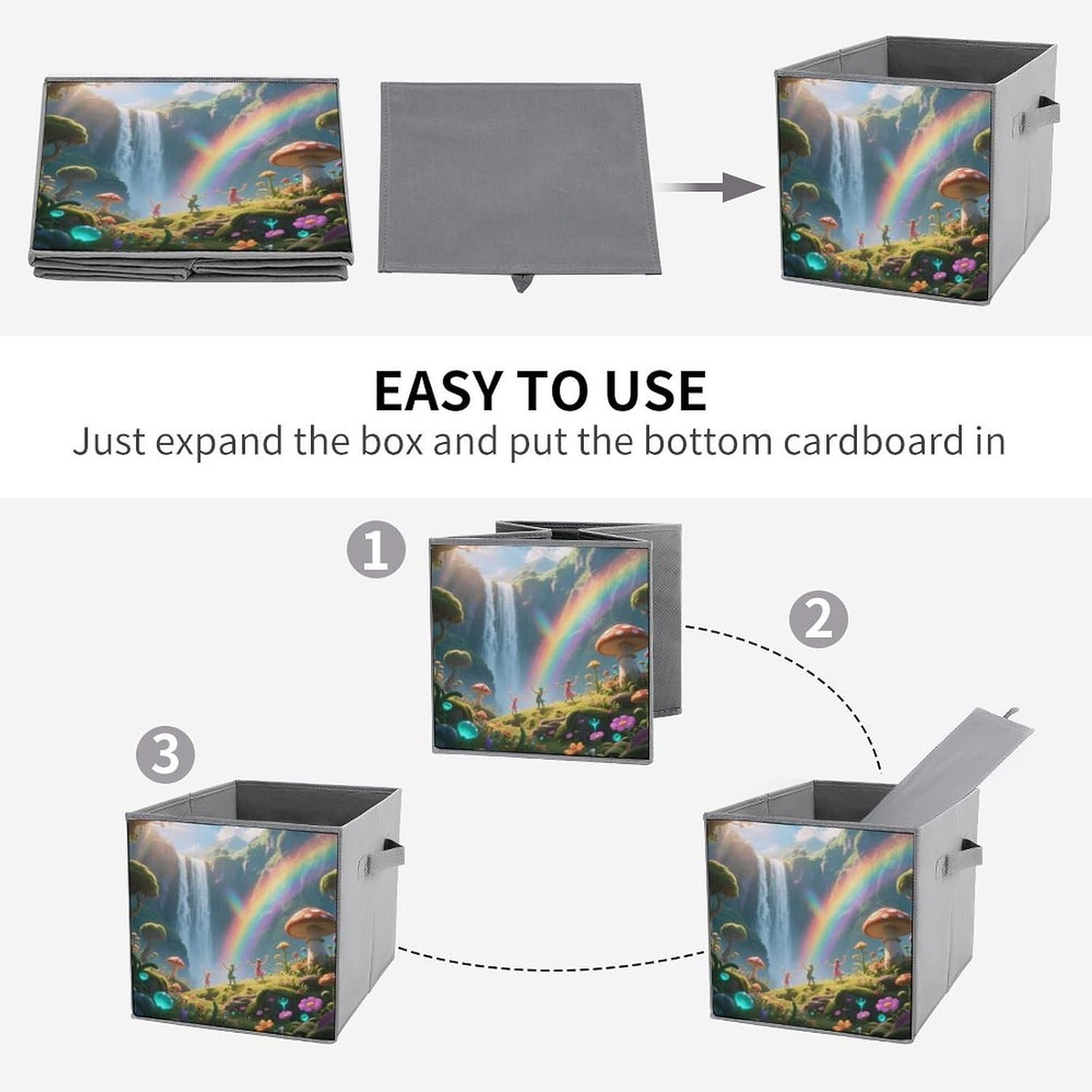 Made of durable, water-resistant 2-piece Oxford Cloth for long-lasting use. Tear-resistant for daily use. The lidless design allows for quick access to items, perfect for storing frequently used items such as clothing or blankets. Sturdy double handles on both sides make it easy to carry between rooms. The reinforced, removable base provides good structure and stability. Simply disassemble for compact storage or easy cleaning, the 10.6x10.6x10.6 inch square size has plenty of space to store large items and fits neatly under the bed, on a shelf or in a closet. Use it in the bedroom, living room, garage, or even as a stylish laundry basket.