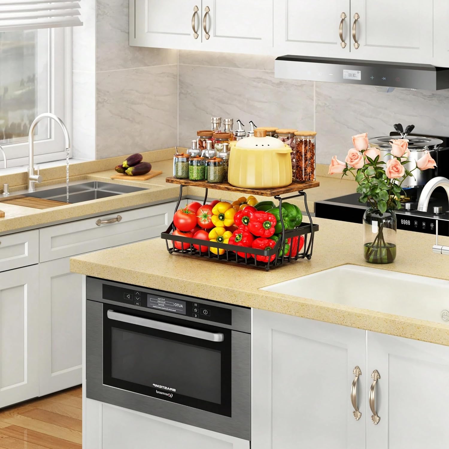 Transform your kitchen organization with this elegant 2-tier fruit and vegetable storage solution from Orehlik. The thoughtfully designed rack features a spacious wooden top shelf perfect for spice jars, condiments, and kitchen essentials, while the sturdy wire basket below provides ample space for fresh produce. The black metal framework combines style with functionality, complementing any kitchen decor while maximizing counter space efficiency. The durable construction pairs a solid wood board with heavy-duty iron wire baskets, finished with a smooth powder coating that ensures lasting performance. Convenient side hooks offer dedicated spots for hanging items, making the most of the vertical space. This versatile storage rack keeps fruits and vegetables easily accessible while creating additional storage opportunities on the wooden top tier. The compact yet spacious design fits perfectly between countertops and cabinets, helping you maintain an organized and clutter-free kitchen while displaying your fresh produce beautifully.