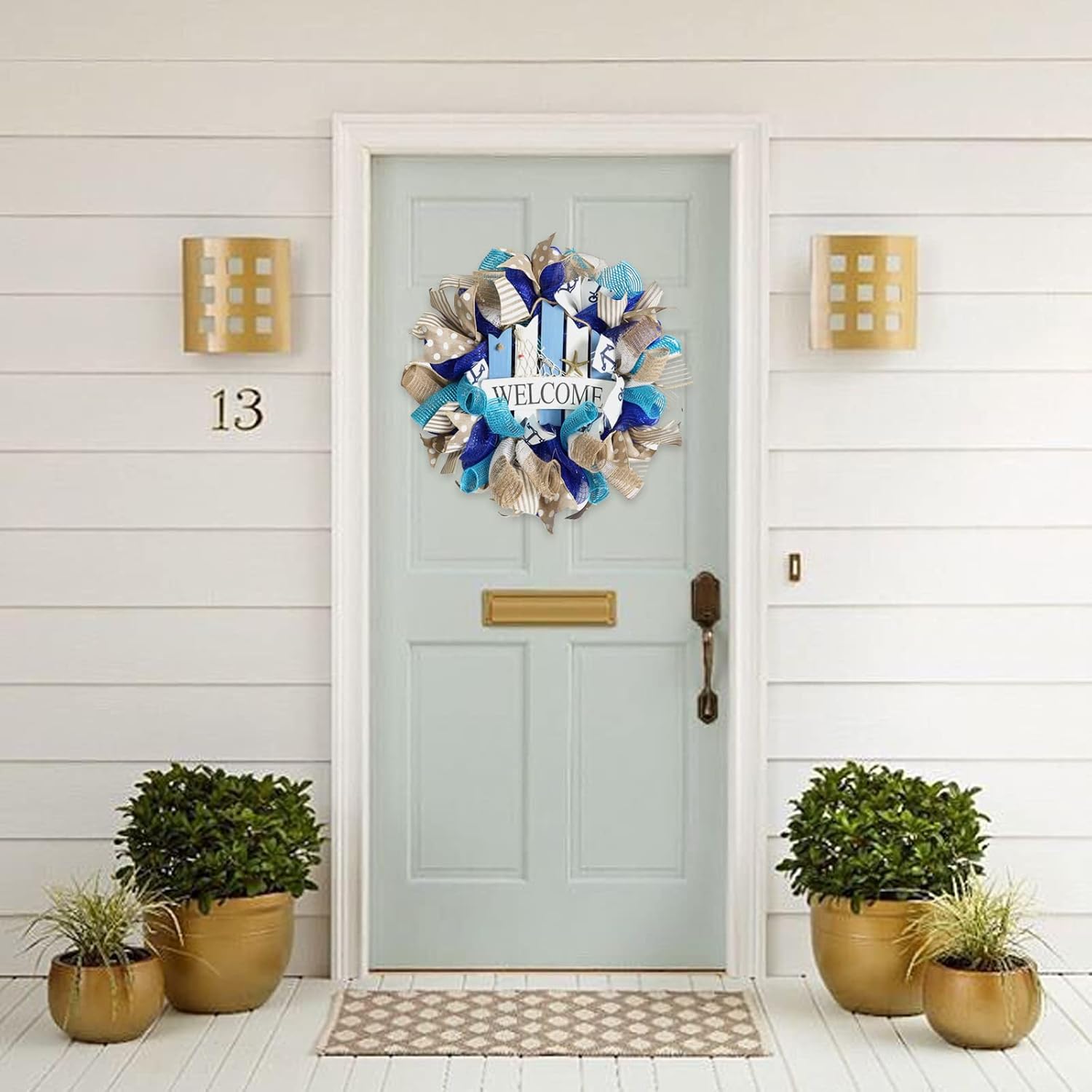 Blue color is a classical color for the coming season, bring your live place cool feeling. So the wreath use natural burlap ribbon and blue mesh deco, if you can looking for a special costal summer wreath, this full blue mesh door wreath will be a good choice for this summer.
