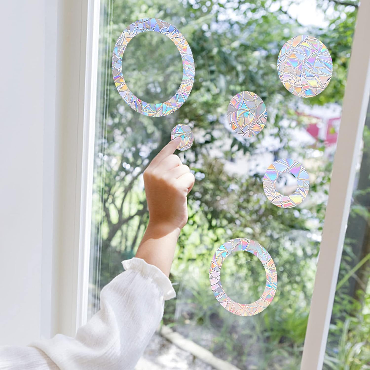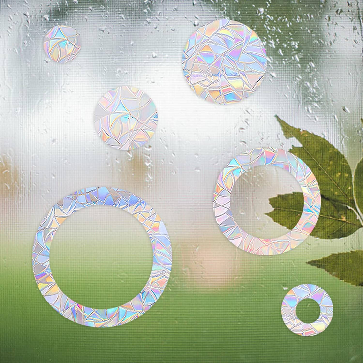 Specification: Name: round crash window sticker Material: PET film. Colour: translucent. Quantity: 24 pieces. Diameter: 4 cm x 8 pieces, 6 cm x 2 pieces, 8 cm x 6 pieces, 10 cm x 2 pieces, 12 cm x 4 pieces, 16 cm x 2 pieces