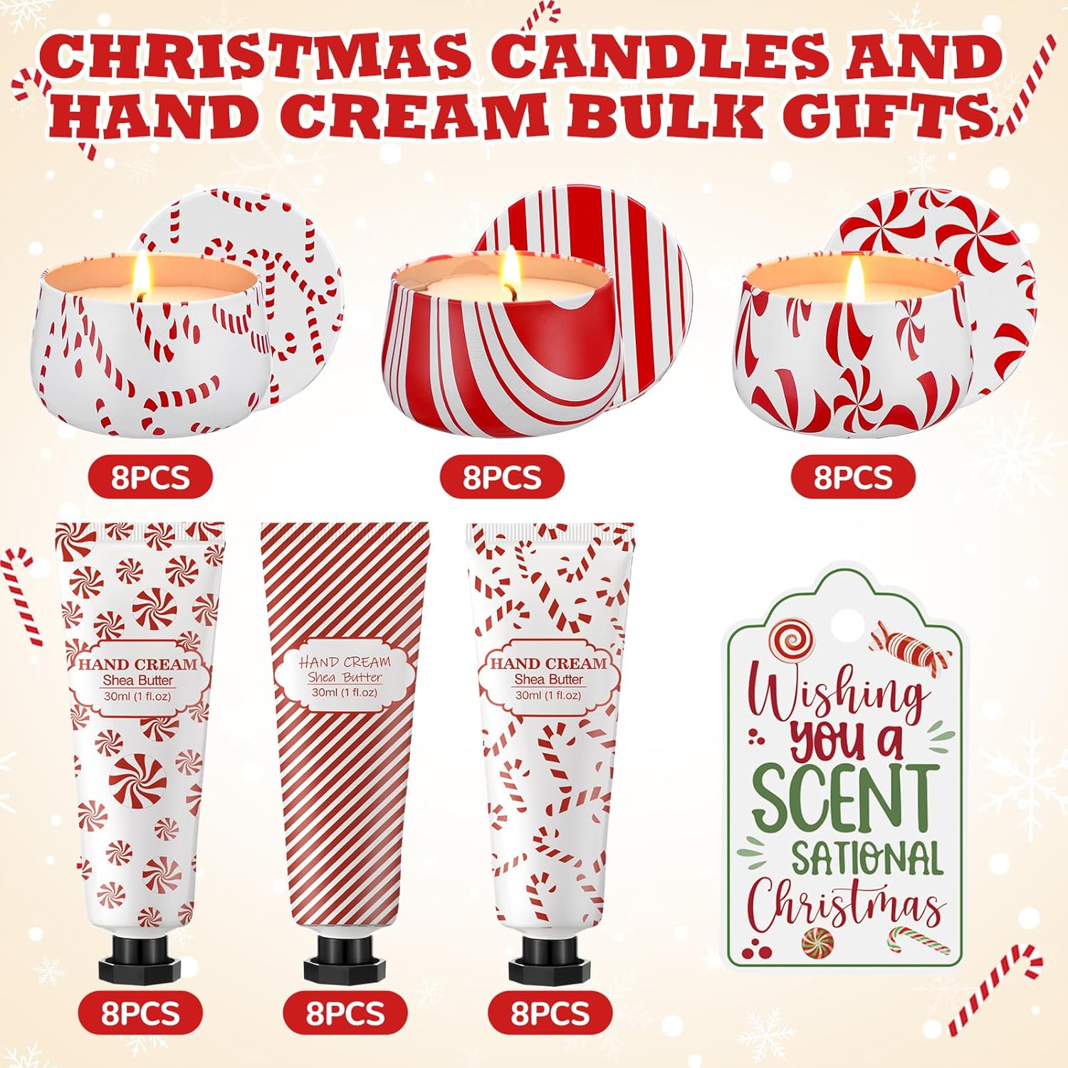• Bulk Candy Cane Design Gifts: the package contains 24 pieces 3.5 oz scented Christmas candles, 24 pieces 30ml Christmas hand cream for women and 24 pieces matching paper cards, ample quantity to meet your most needs, whether it's a personal gift, family sharing, or bulk holiday giveaways for offices, or community events, all in a cheerful candy cane design, nice for spreading holiday joy