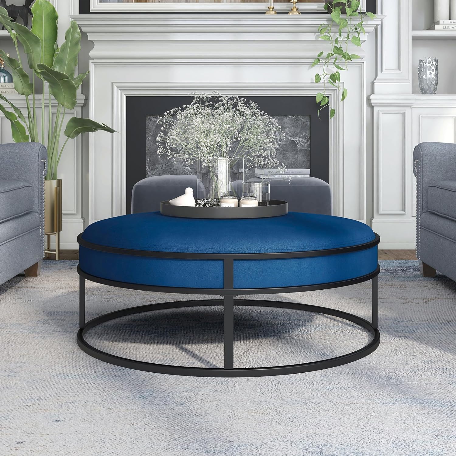 This chic gorgeous ottoman is a captivating centerpiece, Whether you're kicking your feet up on the blue navy plush foam-filled top or setting a tray of drinks and snacks down for your family and friends. This ottoman is crafted with a sturdy metal base and plywood construction, and a smooth velvet and comes with colors to fit your style and need.