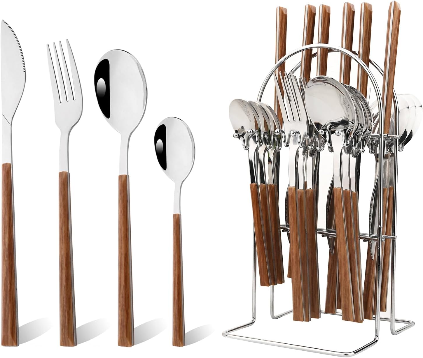 Color:White silver Unique Design - Mirror Shiny stainless steel - Serving set for home daily use, restaurant, kitchen, party, wedding,buffet etc. - Basic cutlery serving set. - Portable Classic handle. Size Knife Dimensions: Length: 8.78 inch Weight: 30g Dinner Spoon Dimensions: Length: 8.11 inch Weight: 40g Tea Spoon Dimensions: Length: 6.22 inch Weight: 20g Dinner Fork Dimensions: Length: 8.26 inch Weight: 40g Cake Fork Dimensions: Length: 6.3 inch Weight: 20g Cutlery Rack Length: 5.12*5.71*10.04 inch Weight: 250g All tableware are designed according to ergonomics, suitable weight and comfortable placement, suitable for any scene, creating the most comfortable dining experience for you. Wish you have a pleasant shopping experience!