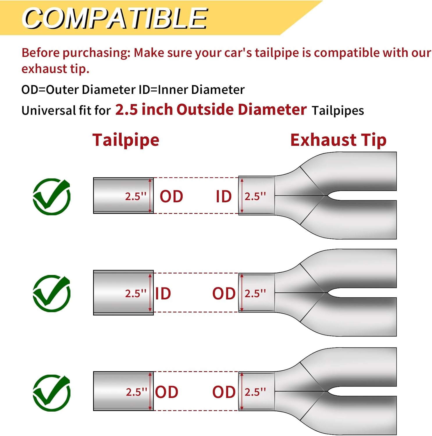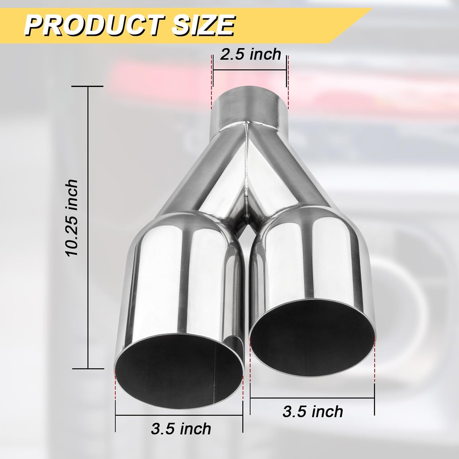 • 【Dimension】2.5 inch Inlet; 3.5 inch Outlet; 10.25 inch Overall Length. ONLY Universal fit for Vehicles with 2.5 inch Outside Diameter Exhaust Pipes (Note: Please Make Sure The Outside Diameter of Your Vehicle Tailpipe Outlet is 2.5" Before Purchase, Note it must OD not the ID)