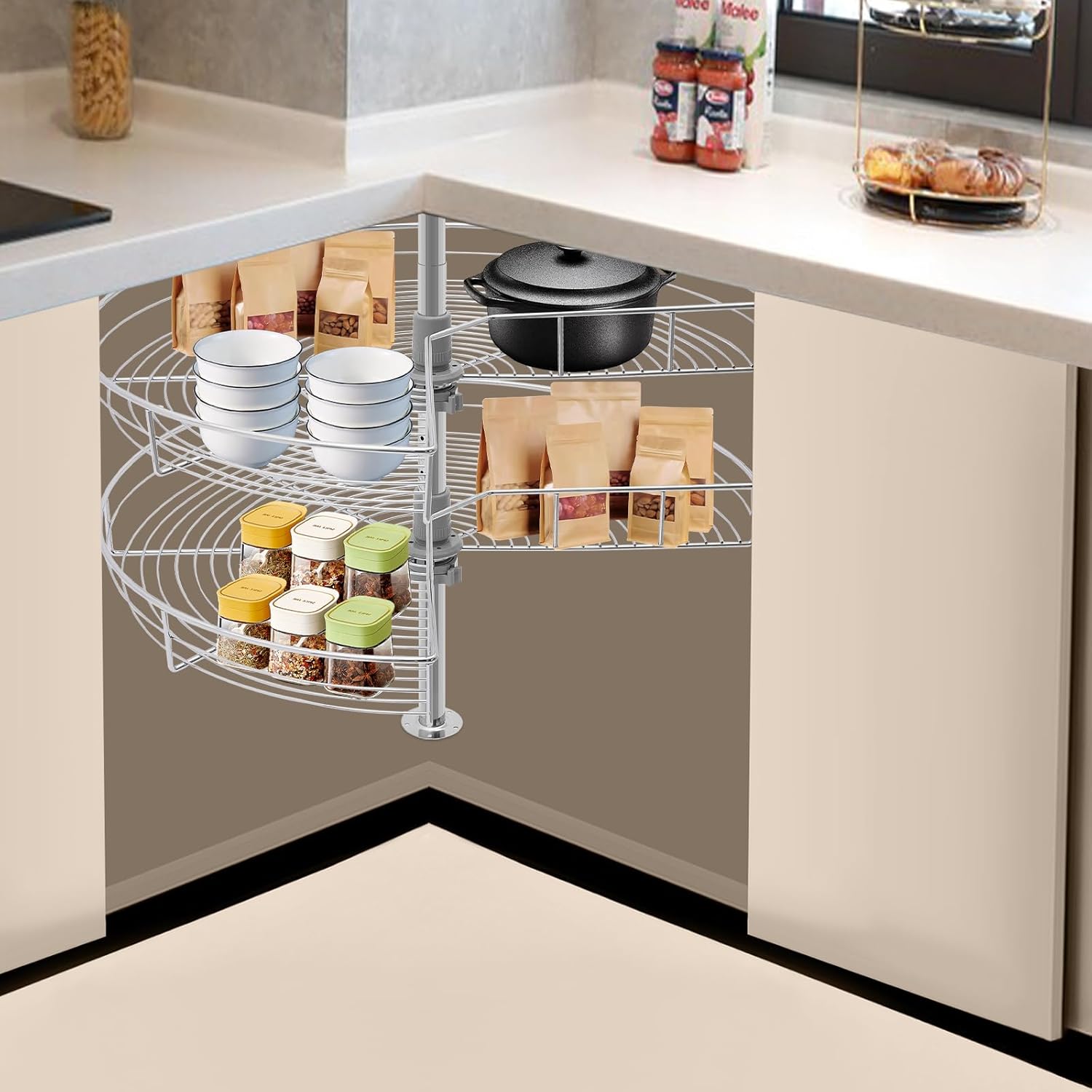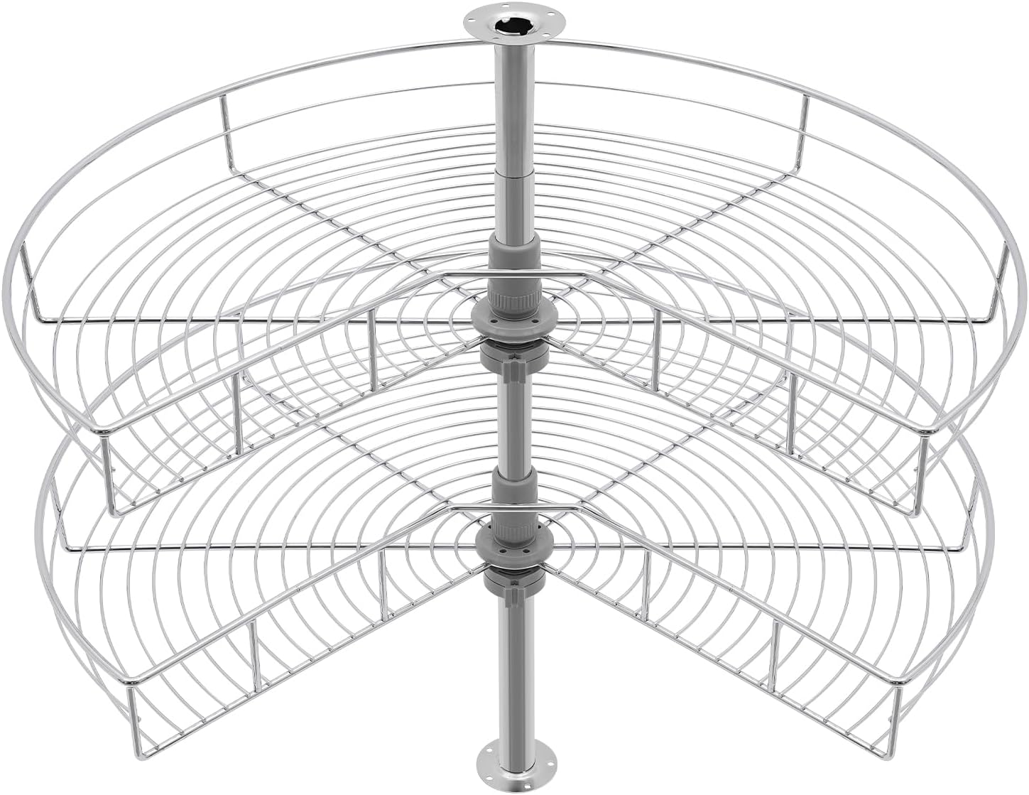 28" Corner Cabinet 2-tier Cabinet Corner Organizer Lazy Susan Turntable Cabinet Organizer Adjustable Chrome Replacement Shelves for Kitchen Corner Cabinet Load 55.12 lbsDescriptionIn the kitchen, the birthplace of fine dining, every inch of space counts. Look at our amazing corner cabinet organizer to get your kitchen organized. It is made of premium and durable material. The highlight of this product is its rotation design. It makes full use of the corner space of the cabinet, and the corners are rounded to prevent scratching fingers. Don't let the clutter of the kitchen affect your cooking mood. Choose it, cooking will become more relaxed and enjoyable!How to Install1. Attach the plastic parts to the shelf.2. Place the lower basket into the cabinet.3. Then put on the upper basket.4. Tilt the upper basket and insert the bar.5. Let the bar go through the lower tray and fittings.SpecificationStyle: ModernColour: SilverMaterial: Iron, PlasticProcess: ElectroplatingAssembly Required: YesNumber of Tiers: 2Rotation Angle: 360°Applicable Cabinet Diameter: ≥75cm/29.53inMounting Type: In the Cabinet InstallationOverall Load-capacity: About 25kg/55.12 lbsAdjustable Height Range: 56-79cm/22.05-31.1inEach Basket Diameter: 71cm/ 27.95 inBearing Rod Diameter: 2.4cm/0.94 inPackage Size: 71*16.5*61cm/27.95*6.5*24.02 in Gross Weight: 7kg/15.43 lbsPackage Included1* Corner Cabinet Organizer1* English Manual