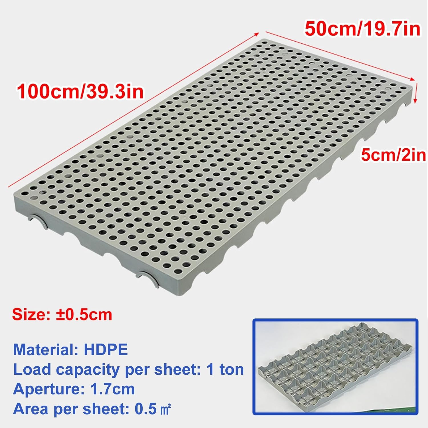 Specifications: Name: Plastic Pallet/Moisture-proof Mat/Warehouse Mat Material: HDPE Color: Blue, Gray, Green, Red, White Load-bearing capacity: 2000lbs/㎡ Product size: 39.3*19.7*2"/100*50*5cm Use: Waterproof, wear-resistant, cold-resistant, moisture-proof, strong load-bearing capacity Applicable scenarios: warehouses, workshops, maintenance, supermarkets, industry, commerce, factories Description: Thickened side structure improves load-bearing capacity Bottom grid design facilitates air circulation and heat dissipation Anti-slip particles on the front Height 2 inches/5cm, ensuring the safety, moisture-proof and waterproof of items Contents include: Moisture-proof Pallet x 2