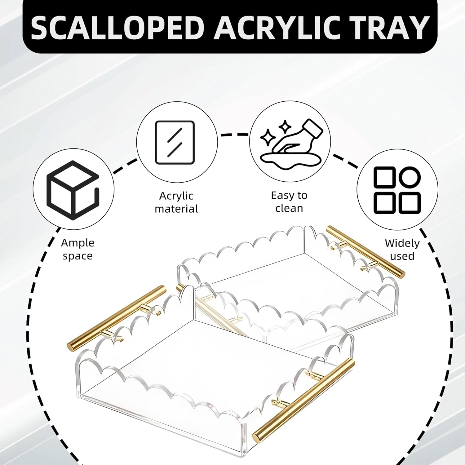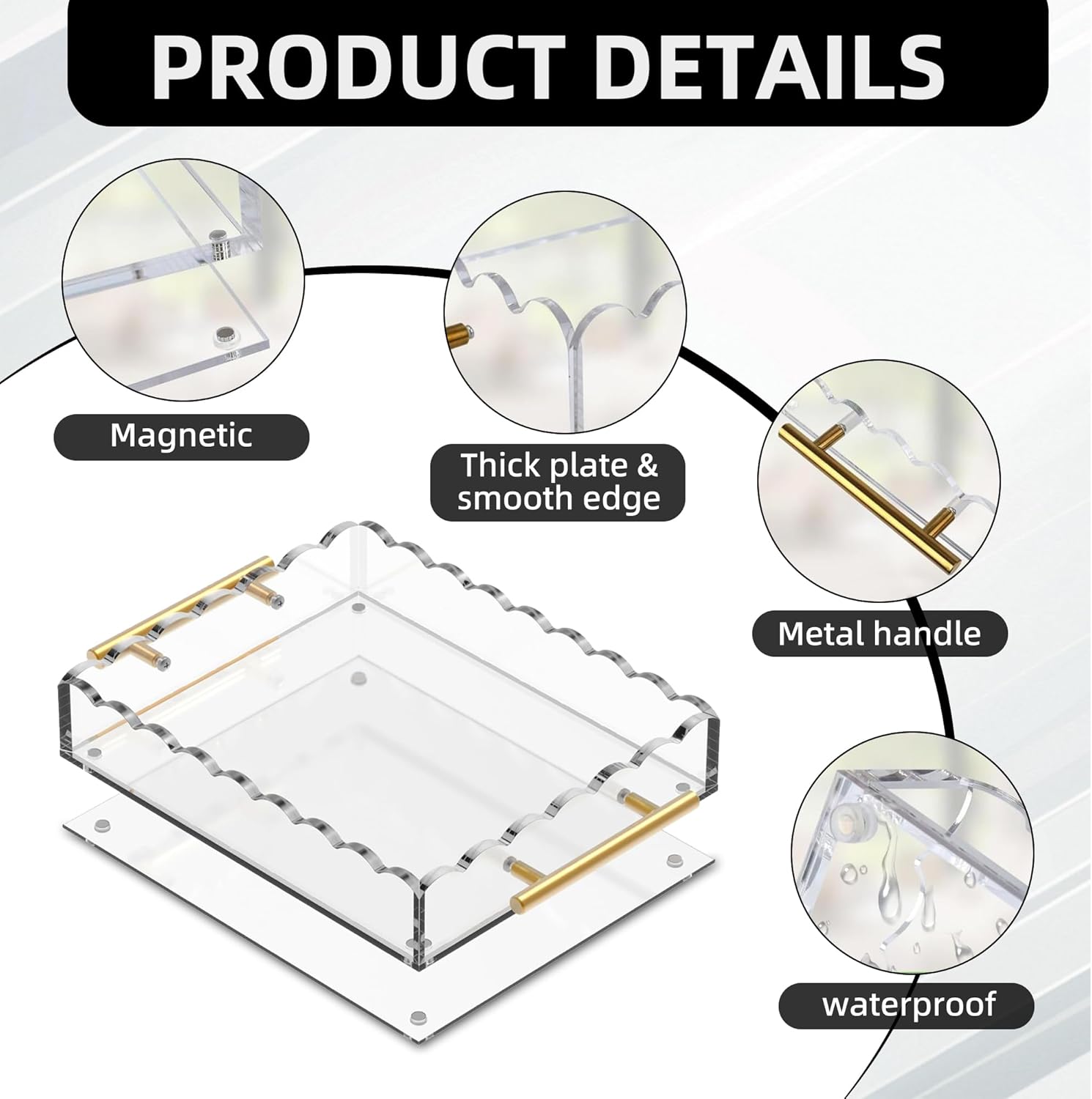 ★Enhance your home with this elegant Scalloped Acrylic Serving Tray Set.★Each tray features a magnetic bottom design that allows you to insert and display your favorite photos, prints, or seasonal artwork. ★The clear acrylic construction paired with polished copper handles creates a modern yet timeless look that fits effortlessly into any home décor.★The set includes two trays (10×12 inch and 8×10 inch), making it versatile for different uses. ★Use the larger one for serving drinks, desserts, or snacks, and the smaller one as a vanity or bathroom organizer. Perfect for bedroom décor, office organization, or festive holiday displays, these trays blend functionality with elegance.★The magnetic bottom makes it easy to change your display anytime — simply insert new photos or images to match your style or the season. ★Durable, lightweight, and easy to clean, this acrylic tray set is not only practical but also a thoughtful gift for weddings, housewarmings, birthdays, or holidays.★Bring creativity and sophistication to your everyday life with this stylish acrylic serving tray set — where beauty meets functionality.