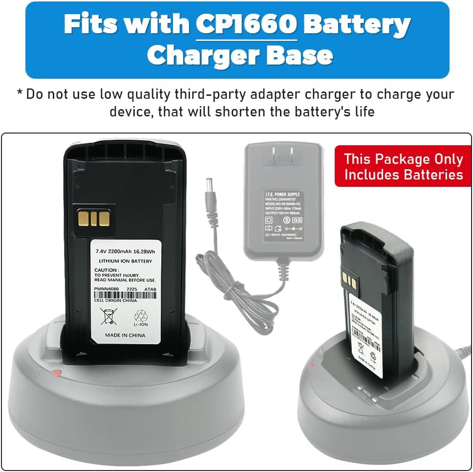 Battery Specifications:Battery Model: PMNN4080Voltage:7.4VCapacity: 2200mAhWatt Hours: 16.28WhChemistry:Li-ion BatteryWeight:141g/0.3lb/4.3oz/pcsCompatible for Mo-torola Two Way Rradio:For CP1300, CP1660, CP185, EP350, CP476, CP477, CP1600, CP1200 RadiosReplace OEM Battery Number: PMNN4081, PMNN4081AR, PMNN4080, PMNN4082, PMNN4476A, PMNN4404ART, PMNN4081ARC, PMNN4082BRNote: 1. Before you order it,please double-check if the item can work for your radio,please check the compatible list2. Factory packed and 100% New, never been used, perfect replacement for your original batteries3. All our batteris was not full charged,please charged it before usedPackage include: 2x Battery2x Belt Clip