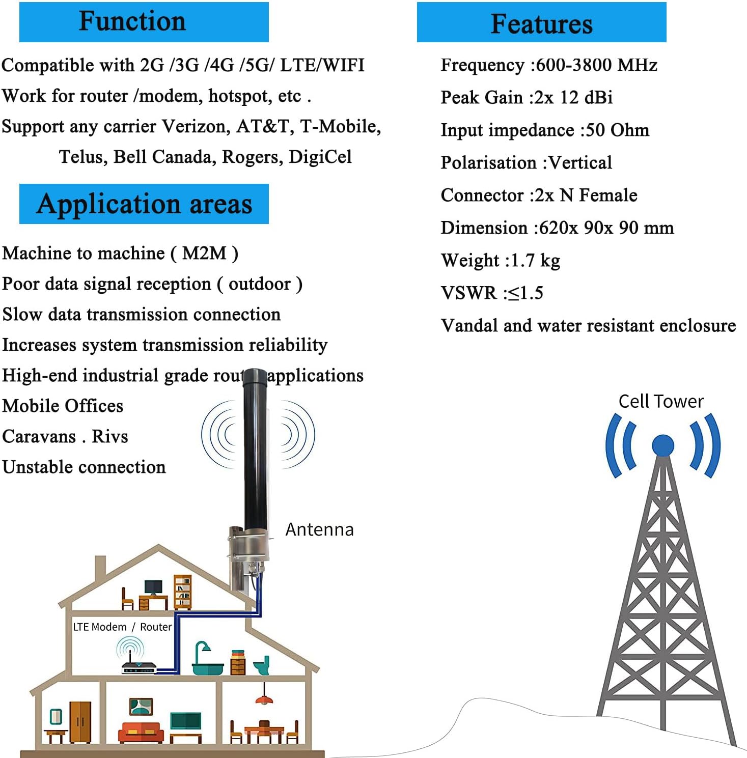 Frequency range-MHz:600-3800MHz. Peak Gain-dBi: 2x 12dBi. VSWR :1.5 . Input Impedance: 50 . Polarization :Vertical . Maximum input power-º: 100 . Lightning protection :DC Ground . Input connector type :2x N Female . Dimensions (mm):90*620 . Antenna weight:1.50 . Operating temperature-º: -40-60 . Rated Wind Velocity-m/s: 60 . Radome material :ABS .Key Features: 2x2 MIMO Performance: Say Goodbye to Slow Network Speed and Low Quality Signal -This Outdoor MIMO Antenna Use Cross-Polarized Antenna- 2 Internal Radiat Elements Inside,Means Signal Speed Better Than with 1 Radiat Element and Causes More Data Speed ≈Twice as Much Signal. Work for all any routers hotspot with detachable antennas with SMA or TS-9 Jack. support any brand router. Use Flow: This ( 5g mimo antenna outdoor) just plug and play, not required any setup.You disconnect the original antenna on the router device, connect one end of the cable to that Jack, and then fix the antenna outside the house and connect the other end of the cable to the antenna. Omni Directional Performance: sends and receives signal in all directions, no required directional aiming, unlike panel antenna & Yagi antenna that require time-consuming effort to position. Wide Band Coverage: support 3G, 5G, 4G, LTE, WiFi, GSM, CDMA. include N71, N5, N2, N66, N41 and N77.