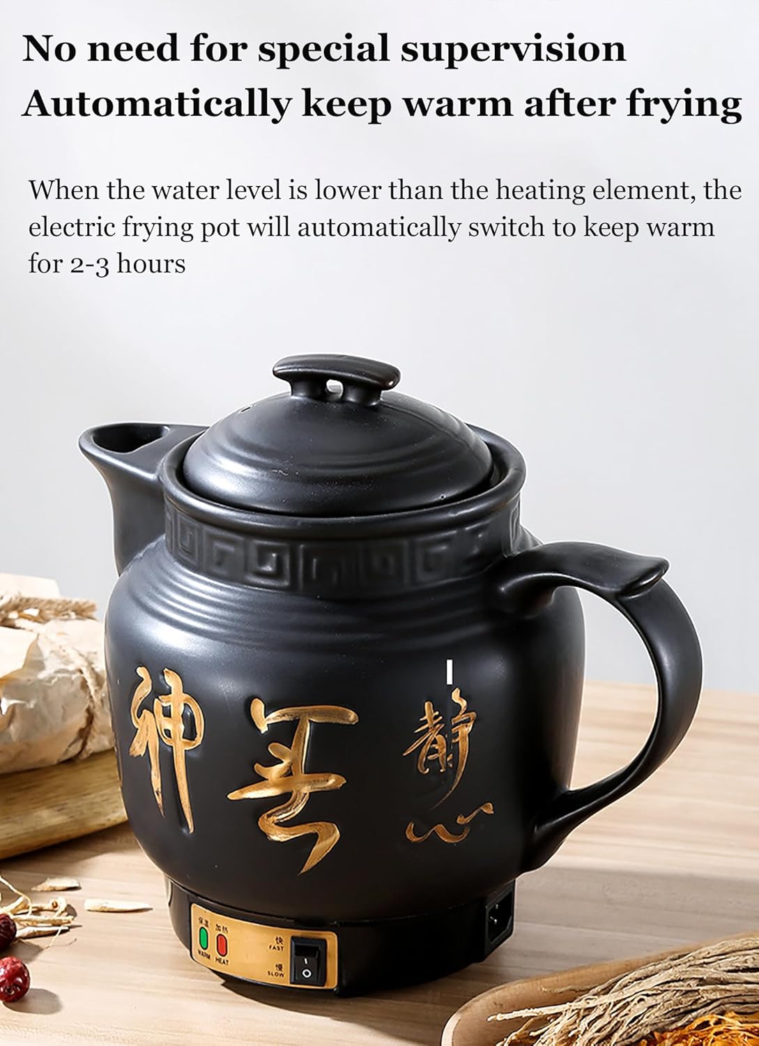 3-6L Multifunctional Electric Chinese Medicine Kettle, Black Ceramic Pot, Traditional Chinese Medicine Pot, Automatic Health Pot, Chinese Herbal Medicine Cooker Product Features: 1. This health pot is mainly used for boiling cold water, boiling cold water supplements, soups, coffee, etc. 2. This health pot is made of ceramic, which is acid-resistant, heat-resistant and does not react with any medicine. 3. It uses high-quality stainless steel heating element, which does not burn or stick to residue during the decoction process and is easy to clean. 4. Ceramic artistic shape, large spout, smooth exhaust, and fine medicinal power. 5. The decoction insulation is fully automatically controlled. The normal decoction liquid volume is kept between eight points and one bowl, and the temperature is automatically kept at about 70℃, without the need for special supervision. Product Information: Product name: Health pot/decoction pot Body material: ceramic Inner tank material: stainless steel heating element Capacity: 3-6L Rated power: 500 (W) Control mode: button type Rated frequency: 50 (HZ) Weight: 4KG Product size: 27.5*25.5*15CM Packing List: Ceramic pot X1 Instruction manual X1 Power cord X1 Precautions: 5. The heat preservation state should not be too long, generally not more than 3-4 hours, to avoid the decoction being absorbed by the residue and repeatedly heated and evaporated, resulting in too little decoction left!