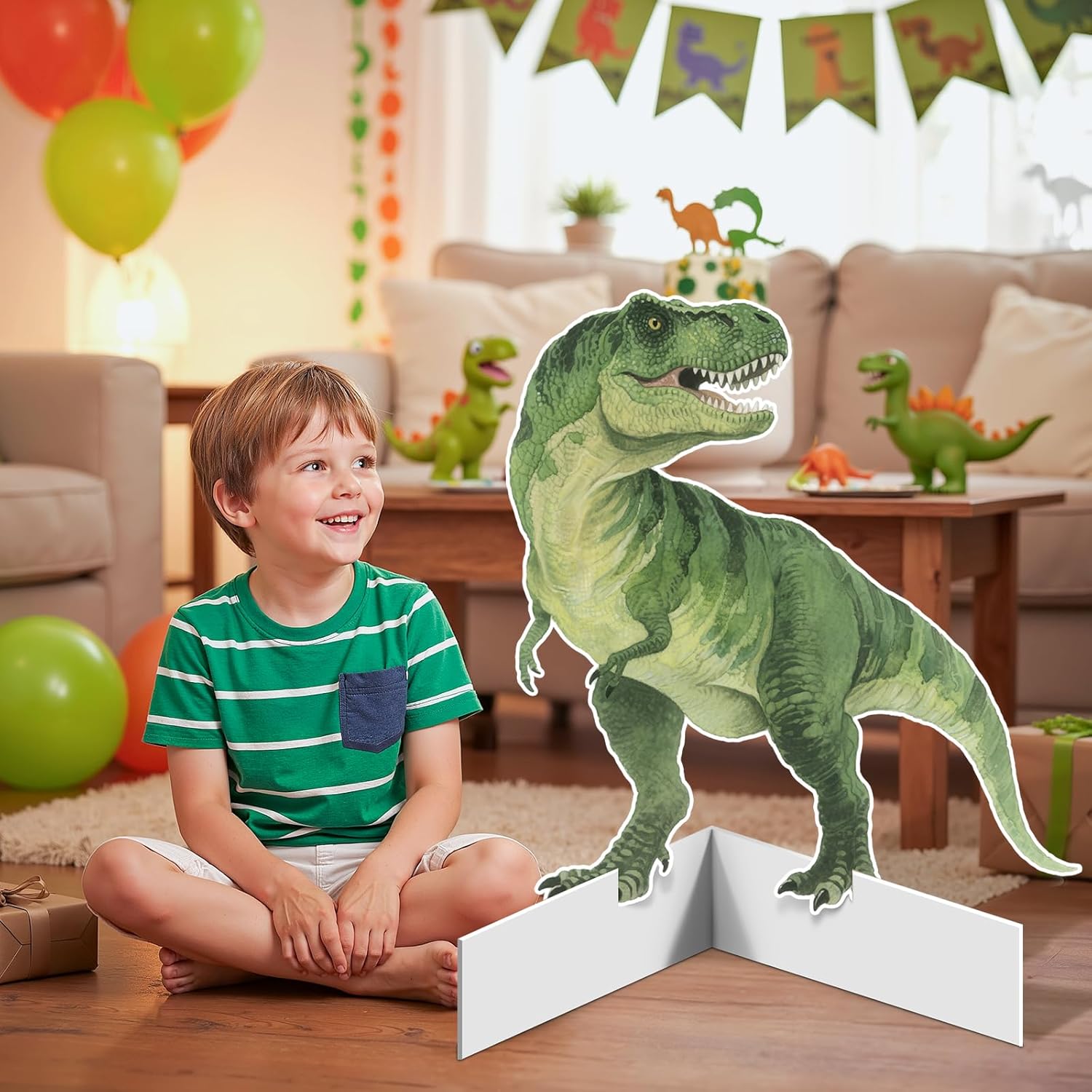 Feature:Transform any space into a thrilling Dinosaur world with our Giant Dinosaur Standup decor! This complete 3-piece set features the most iconic dinosaurs: the towering Brachiosaurus, the mighty Tyrannosaurus Rex, and the formidable Triceratops. Designed to create an immersive experience, these yard signs serve as the perfect photo backdrop and party decor. The kit includes all necessary components for easy assembly: the three giant dinosaur cutouts, 3 sturdy iron H-stands, 10 plastic connecting rods, and 3 acrylic glue accessories to ensure everything stays securely in place.The versatility of this set makes it a must-have for any dinosaur enthusiast! It's the ultimate choice for dinosaur birthday party decorations, theme parties, school events, baby showers, or even as permanent fun decor in a child's bedroom. Watch as these realistic and vividly colored dinosaurs come to life and create unforgettable photo opportunities.Package includes: 3 Dinosaur Cardboard Standup, 3 iron H-shaped stands, 3 connectors, 10 plastic sticks, and 3 acrylic glue accessoriesSpecification: Material: PVCColor: as the picture showsNotice:1. Product size data is measured manually, and there may be a 1-3cm error, thank you for your understanding2. Due to the light and the display, the picture may be slightly different from the real product color, thank you for your understanding