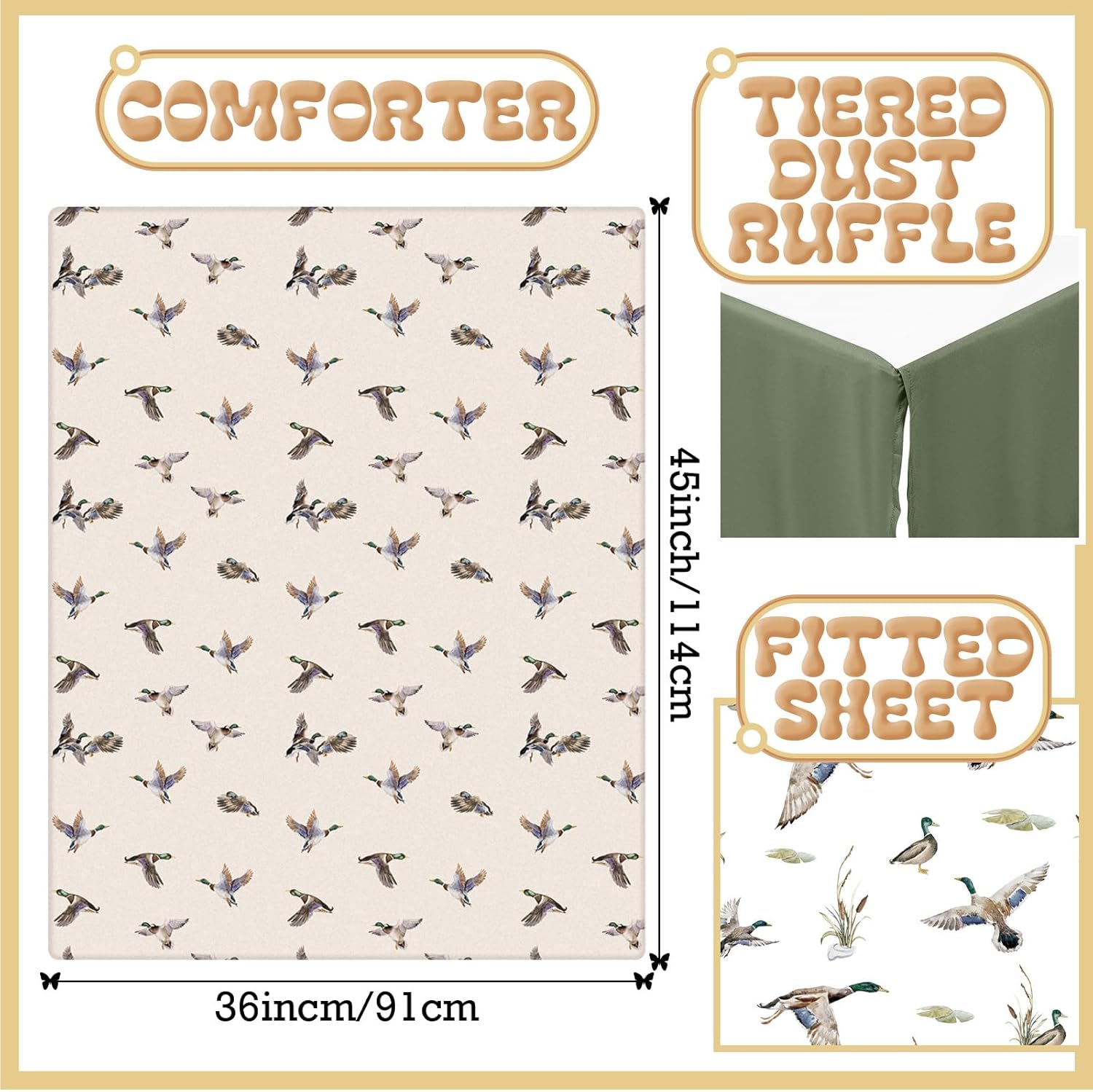 Features: Comfort for your infant: This crib bedding sets, with their soft, cozy materials and charming design, provide optimal comfort for your infants. Encourage quality sleep and ensure your baby wakes up rested and joyful. Easy to maintain: Our crib bedding sets are easy to clean and maintain, ensuring longevity and freshness. Let your baby enjoy sleeping in a clean and comfortable environment. Specifications: Color: green Material: polyester Size: baby comforter: about 45 x 36 inch/ 114 x 91 cm Package includes: 1 x Baby comforter 1 x Fitted sheet 1 x Crib skirt Notes: Manual measurement, please allow slight errors on size. The color may exist a slight difference due to different screen displays.
