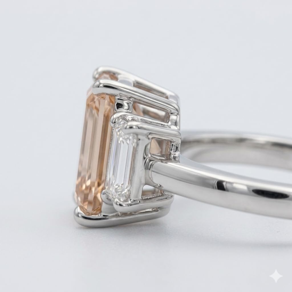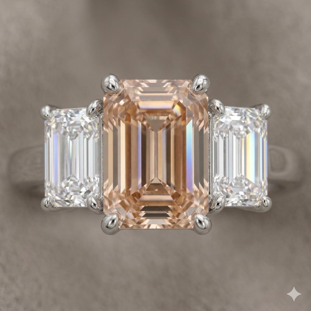 This luxurious three stone lab grown diamond ring features a stunning emerald cut pink center diamond complemented by two brilliant white emerald cut side diamonds. The elegant design highlights the center stone while maintaining perfect balance and brilliance. Crafted in 14K white gold, this ring offers durability, elegance, and timeless appeal. The diamonds feature VVS1 to VVS2 clarity, ensuring exceptional sparkle and quality. This sophisticated ring is perfect for engagements, anniversaries, or fine jewelry collectors who appreciate modern luxury and sustainable lab grown diamonds. Variation Theme Total Carat Weight Variations (12 Items) Variation Total Carat 1 1.45 CT 2 1.80 CT 3 2.01 CT 4 2.03 CT 5 2.04 CT 6 2.04 CT 7 2.17 CT 8 2.25 CT 9 2.25 CT 10 2.50 CT 11 2.50 CT 12 3.00 CT Important Attributes Metal Type: 14K White Gold Diamond Type: Lab Grown Center Diamond Color: Pink Side Diamond Color: White Diamond Cut: Emerald Cut Clarity: VVS1 / VVS2 Ring Size: US 6.75 Stone Setting: Prong Number of Stones: 3