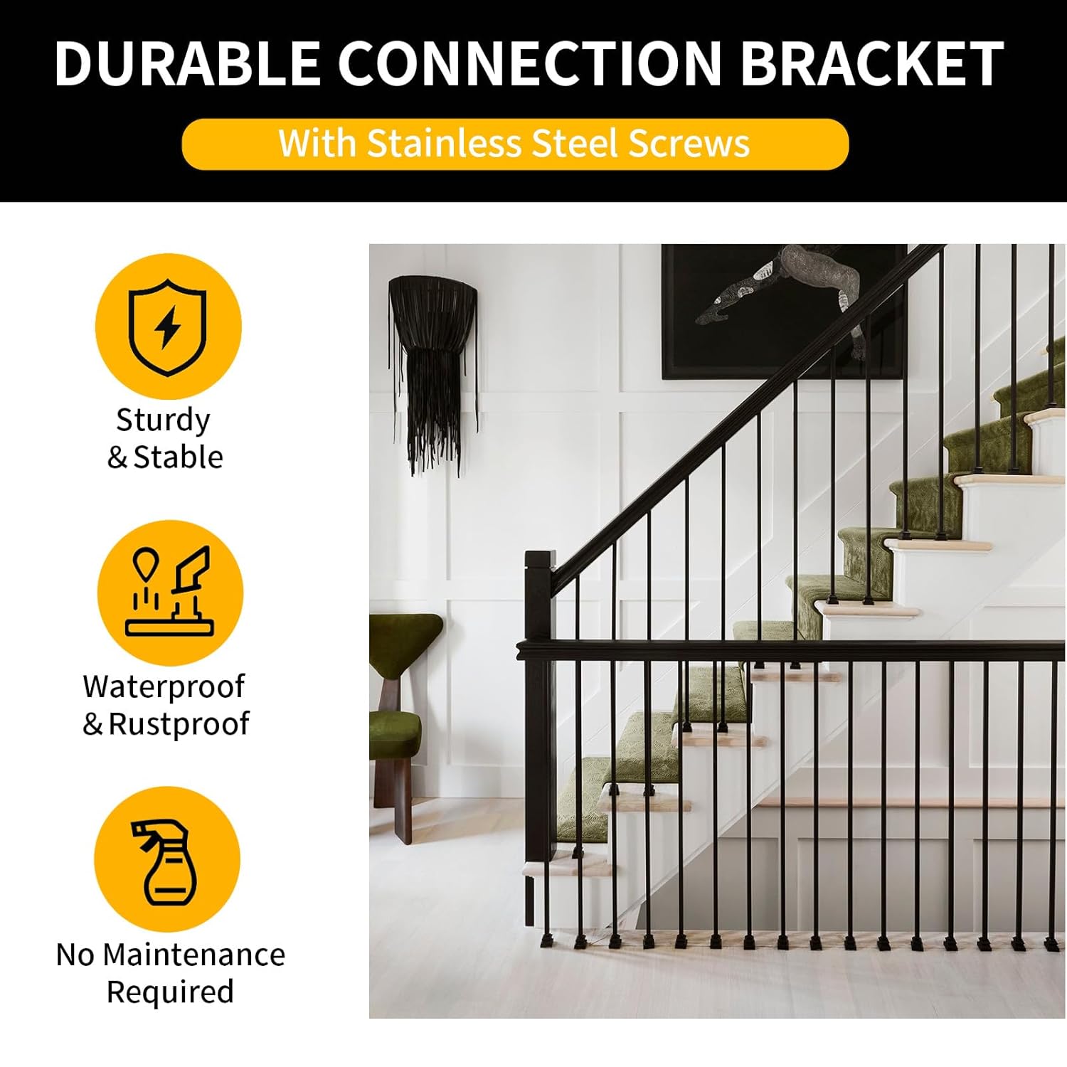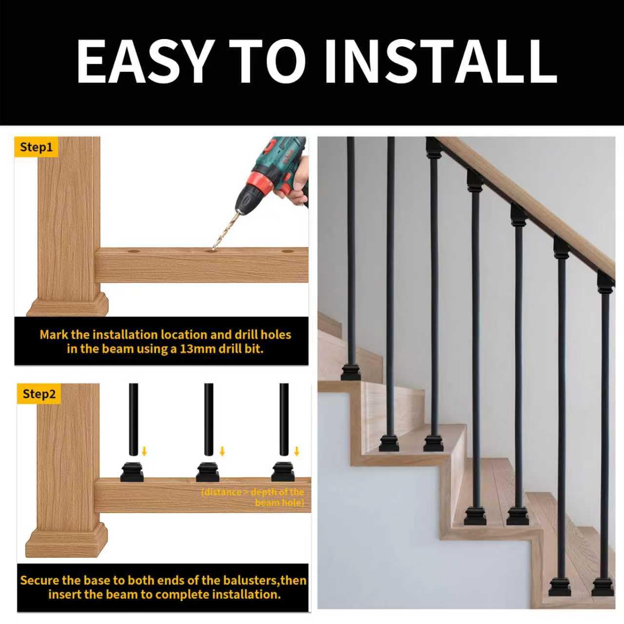SPECIFICATIONS:Material: Wrought Iron Diameter: 5/8 inchs Size: 1.3*1.3*1 inchs Color: Matte Black Use: Suitable for wood fecne balusters,deck balusters,porch balusters,hallway balusters,staircase balusters,etc. Package INCLUDE:30 x horizontal Shoes