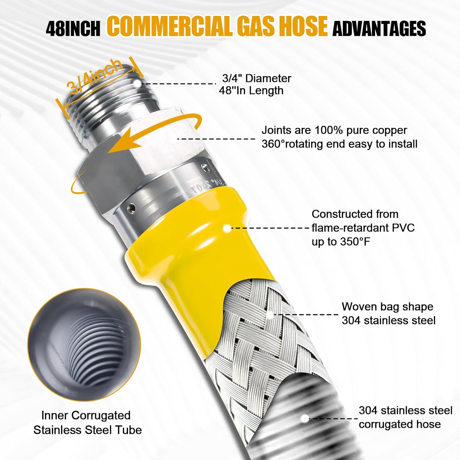 | Included Components | a 3/4" ID gas hose (48" long), 2 pure copper elbows, 1 full-bore valve, a 3/4" quick disconnect, an installation manual, a restraint cable and other fittings/connector accessories |