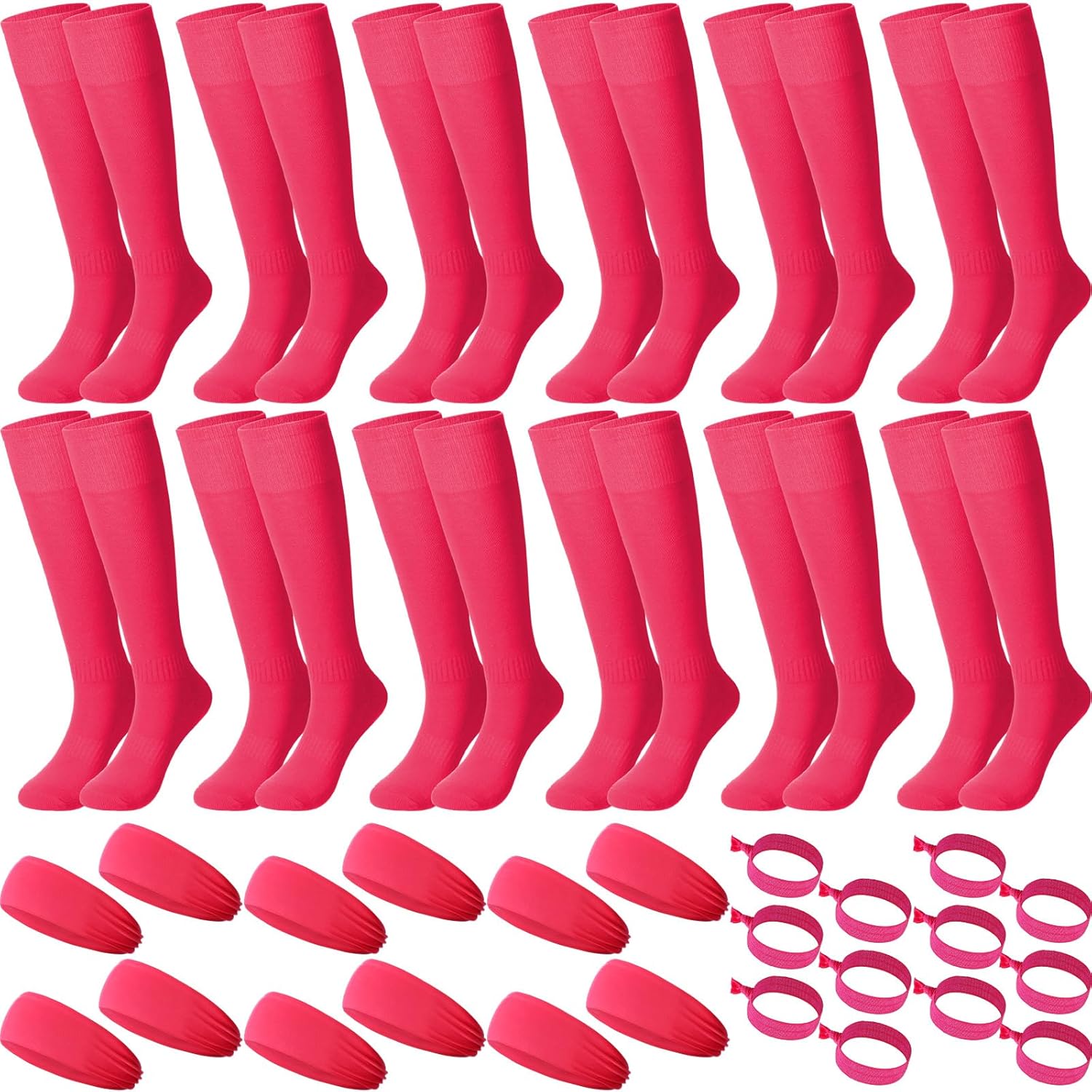 Features: The pink football socks and headband combination is perfect for your daily exercise, training activities, you can also share with your teammates to enhance your relationship and strengthen your work, which will bring them a happy mood. Designed for athletes and fans, this sports set is perfect for football, baseball, softball, hockey and other team sports, these socks, headbands and hair ties will help you stand out and show your team spirit. Specifications: Material: 80% polyester 20% spandex Size: Socks: about 15.75 x 7.87 inches/ 40 x 20 cm Sports headbands: approximately 9.45 x 3.15 inches/ 24 x 8 cm Hair tie: approximately 3.94 inches/ 10 cm long Package includes: 12 x Knee high socks 12 x Headband 12 x Hair tie Notes: Manual measurement, please allow slight errors on size. The color may exist a slight difference due to different screen displays. Test whether there is any allergy on a small part of your skin before use. Please stop applying if there is any discomfort