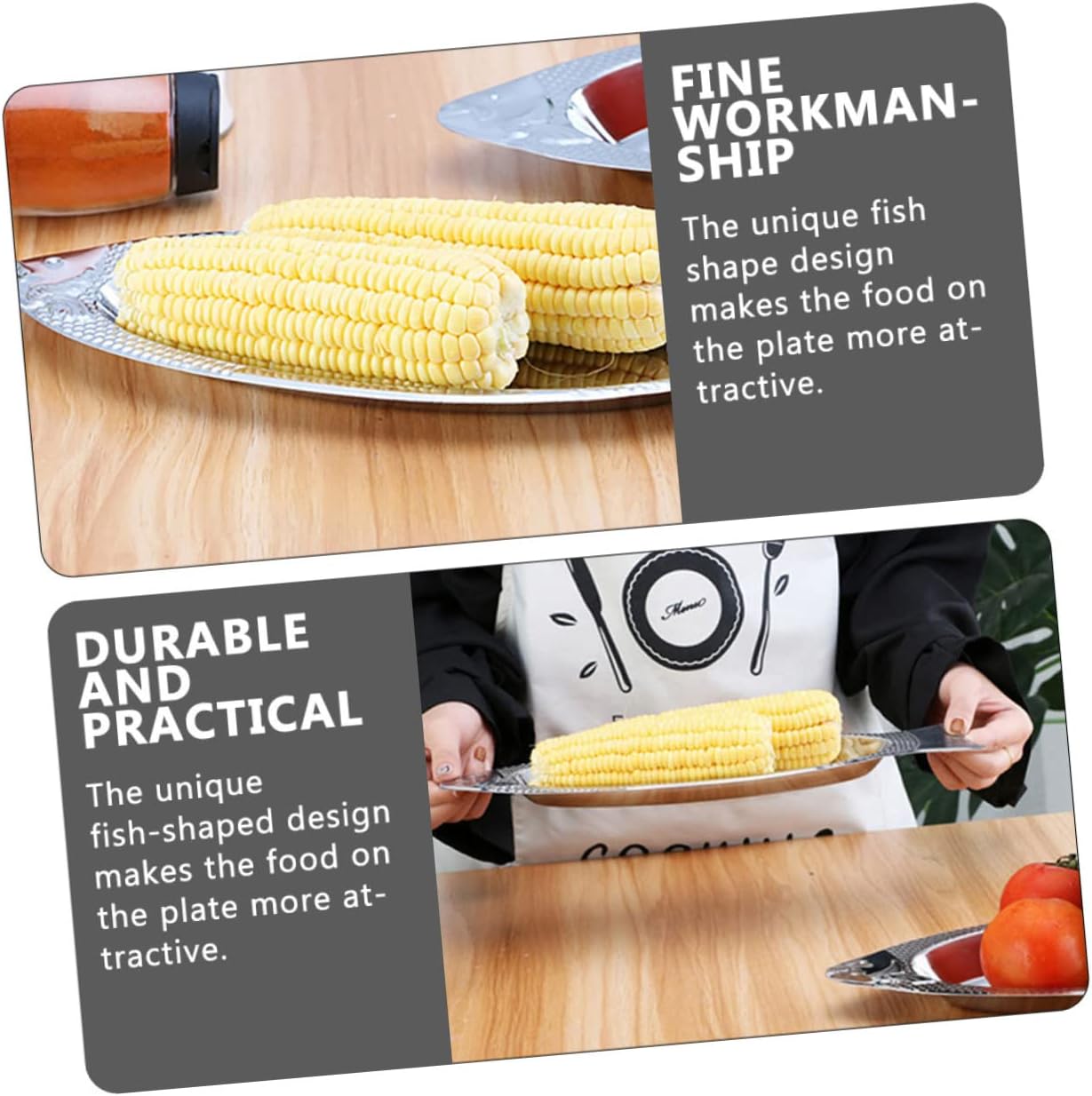 Package Include 3 x Food Plates Features -Material:Stainless steel convenient serving plate -Size :40.00X16.70X2.40cm/15.72X6.56X0.94in serving food plate -Size S:35.00X13.00X1.60cm/13.76X5.11X0.63in stainless steel platter -Size L:45.00X20.30X2.50cm/17.68X7.98X0.98in food storage tray -Color:Silver stainless steel fish serving platter -Stainless steel material, creative fish shape, natural and beautiful for your table stainless steel food tray. -The shape is delicate and lifelike, the color is bright and does not fade, the surface is smooth and polished stainless steel fish -This fish-shaped plate can be used as a present to send to your friends or family members metal serving tray. -Its appearance is like a fish, its shape is realistic and adorable, serving plate is especially suitable for holding fish stainless steel display -Serving plate the food on the plate look more attractive and delicious stainless steel serving tray.Goods Descriptionstainless plate Our Steamed Fish Tray is made of high-grade stainless steel, which is very to use.fish serving platter It has good high temperature resistance and can be put into the microwave oven, oven, to make steamed food.stainless steel food tray Suitable for home, restaurant, hotel and so on.snack storage tray You can safely use this appearance, craftsmanship, and steaming plate to make delicious steamed fish