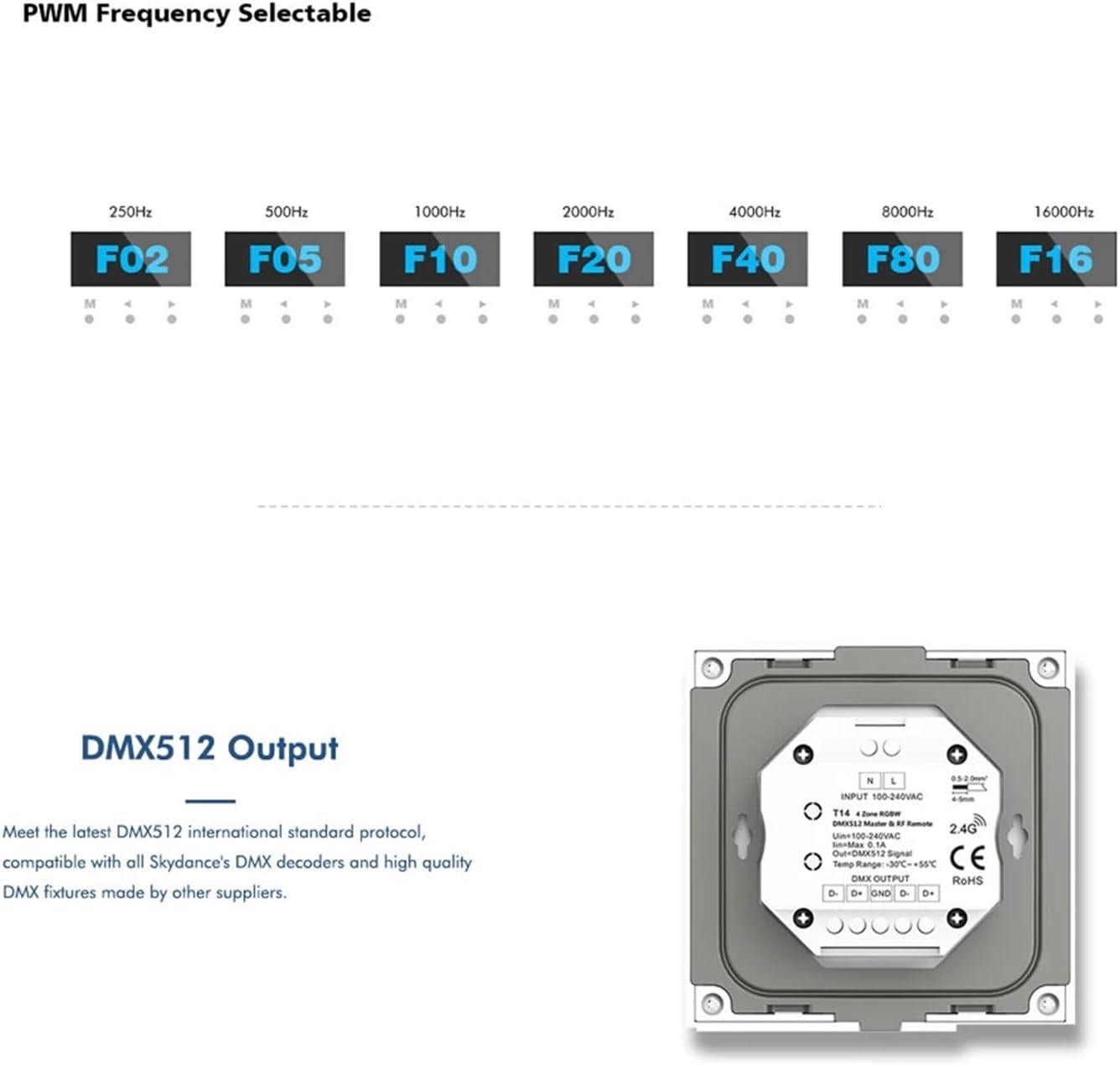 ControllersDimmersComply with DMX512 standard protocol.Digital digital display set the DMX decoding start address through buttons.The RDM function can realize the intercommunication between the DMX host and the decoder.For example the DMX decoder address can be set via the DMX console.1/2/4 DMX channel output optional.16bit (65536 levels)/8bit (256 levels) grayscale options are available.PWM frequency 250/500/1000/2000/4000/8000/16000Hz optional.Logarithmic or linear dimming curve available.Overheating/overload/short circuit protection automatic recovery.D4-P has a green terminal DMX signal portInput voltage: 12-48VDCInput current: 32.5AOutput voltage: 4×(12-48)VDCOutput current: 4×8A@12/24V; 4×6A@36/48VOutput power: 4×96W@12V 4×192W@24V; 4×216W@36V 4×288W@48VOutput type: constant voltage