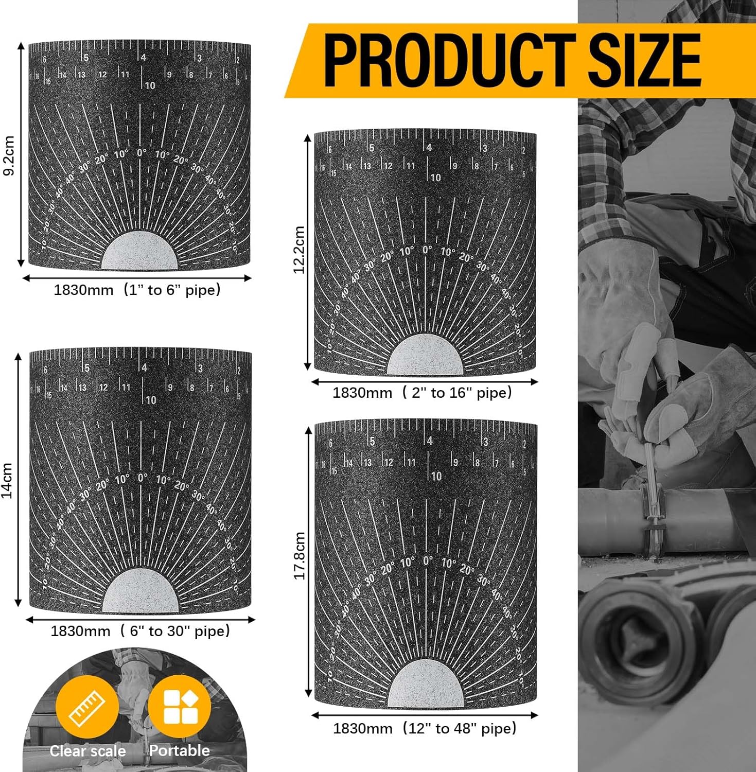 Features: Ideal for plumbers, contractors, and DIYers, it ensures precise measurements for installations, repairs, or inspections, avoiding costly mistakes from inaccurate sizing. The 4-piece set organizes neatly in drawers or toolboxes, keeping your workspace tidy without sacrificing accessibility – ideal for both workshop garages and home utility rooms Specifications: Material: fiber Color: black Size: 1" to 6" pipe: about 72.05 inches/ 1830 mm of the length, about 3.62 inches/ 9.2 cm in width. 2" to 16" pipe: about 72.05 inches/ 1830 mm of the length, about 4.8 inches/ 12.2 cm in width. 6" to 30" pipe: about 72.05 inches/ 1830 mm of the length, about 5.51 inches/ 14 cm in width. 12" to 48" pipe: about 72.05 inches/ 1830 mm of the length, about 7.01 inches/ 17.8 cm in width. Package includes: 4 x Pipe measuring tool Notes: Manual measurement, please allow slight errors on size. The color may exist a slight difference due to different screen displays.